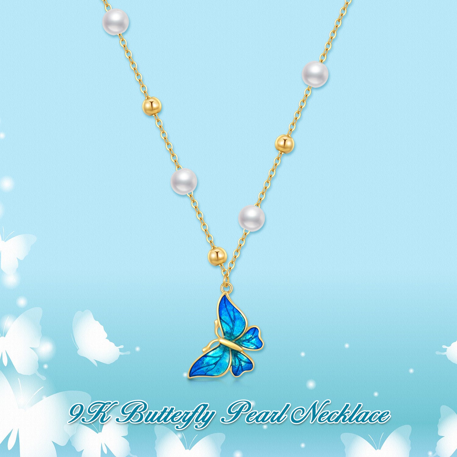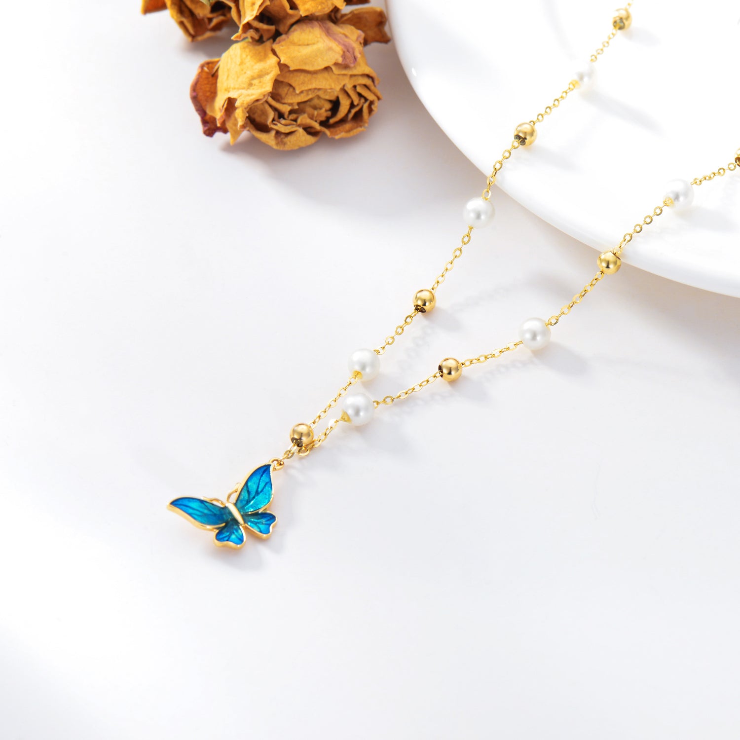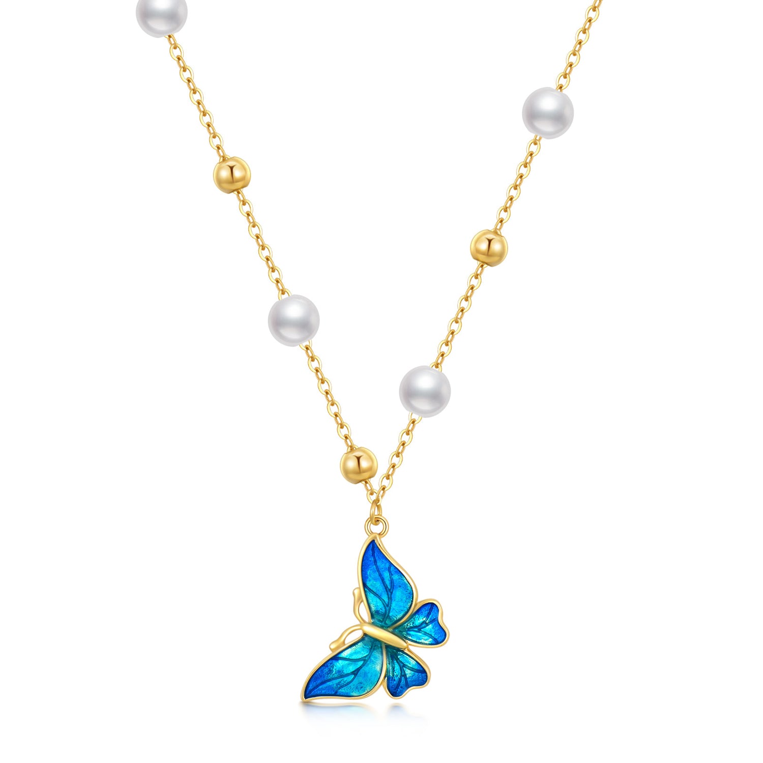 14K Gold Circular Shaped Pearl Butterfly Pendant Necklace