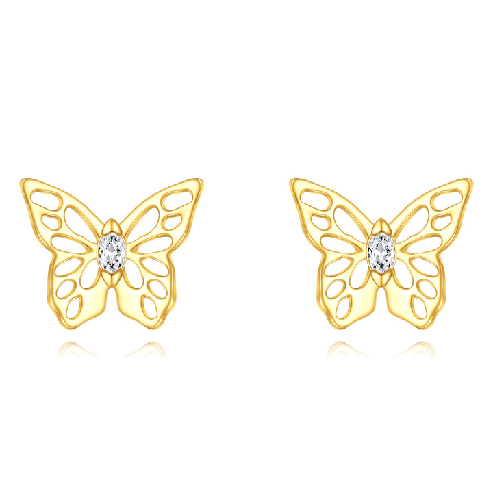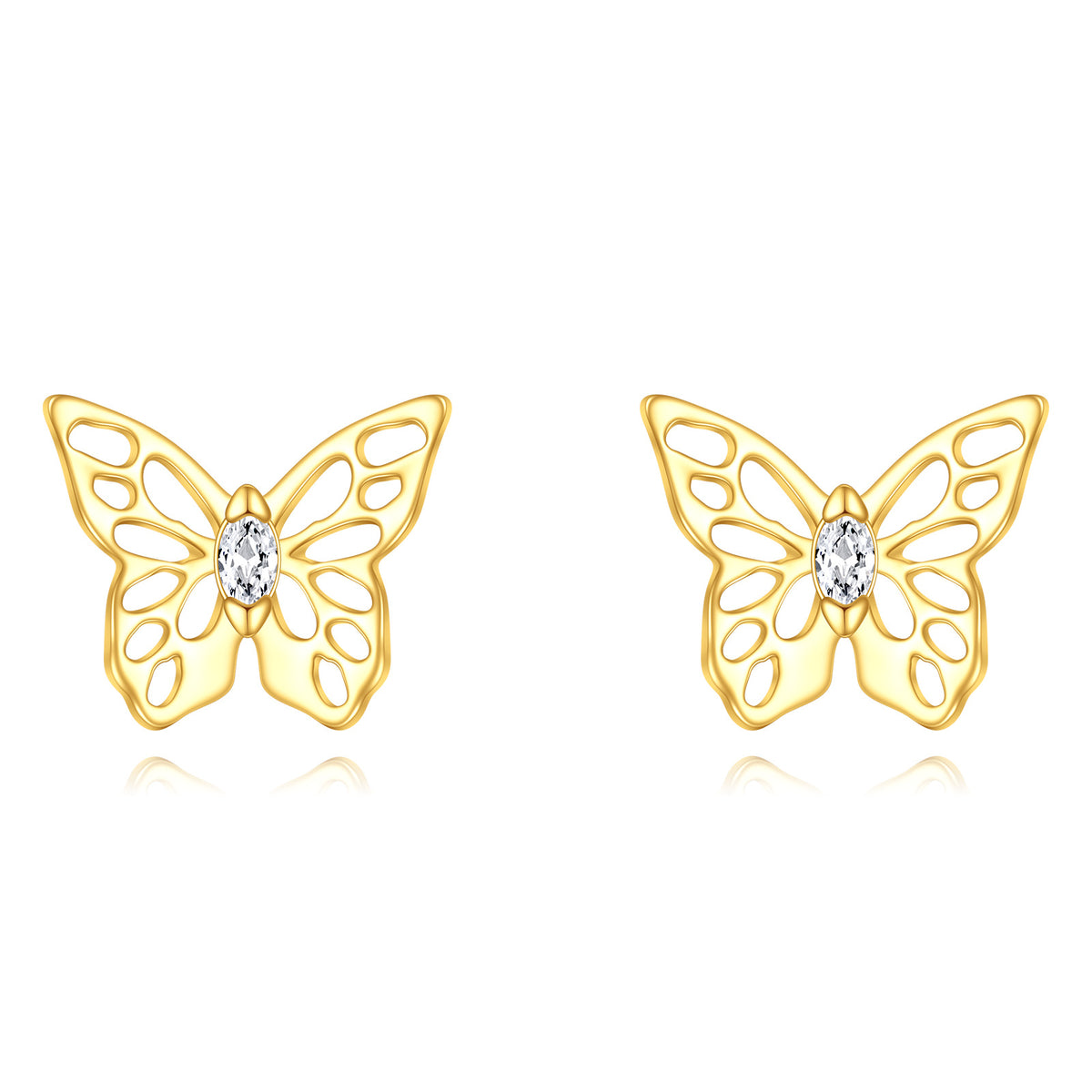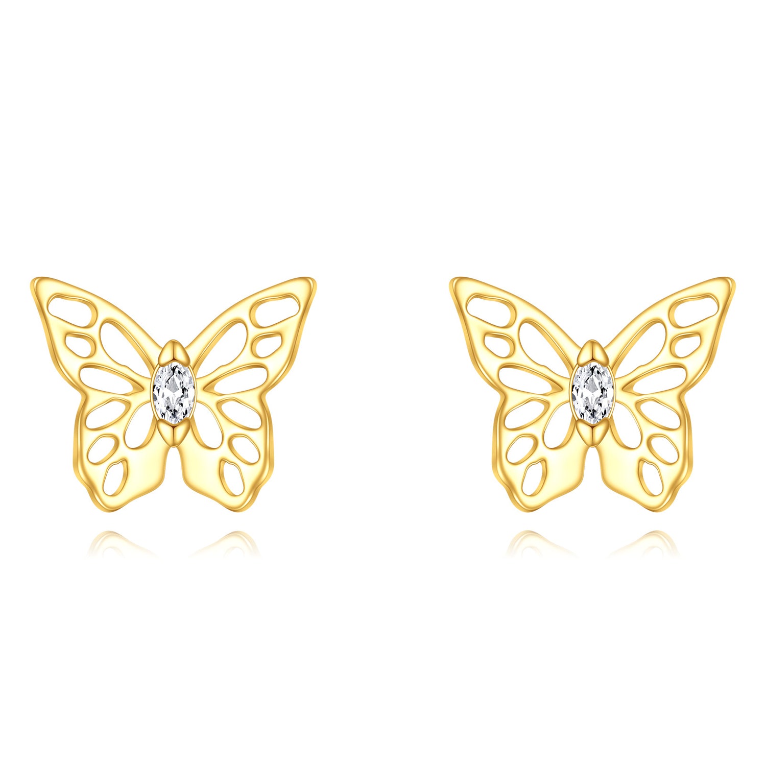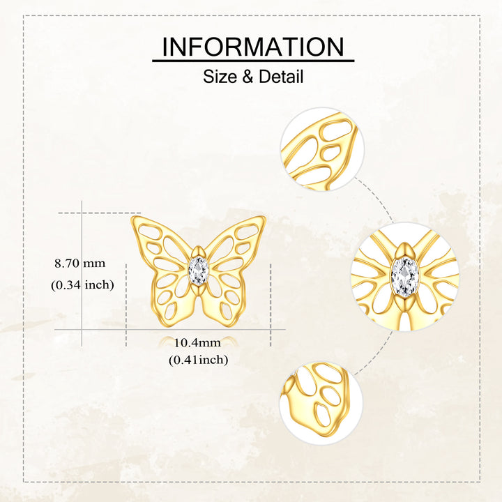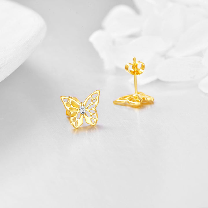 Crafted in 14K gold with moissanite stones set in butterfly-shaped studs. Standard stud dimensions and secure post backing per YFN specifications.