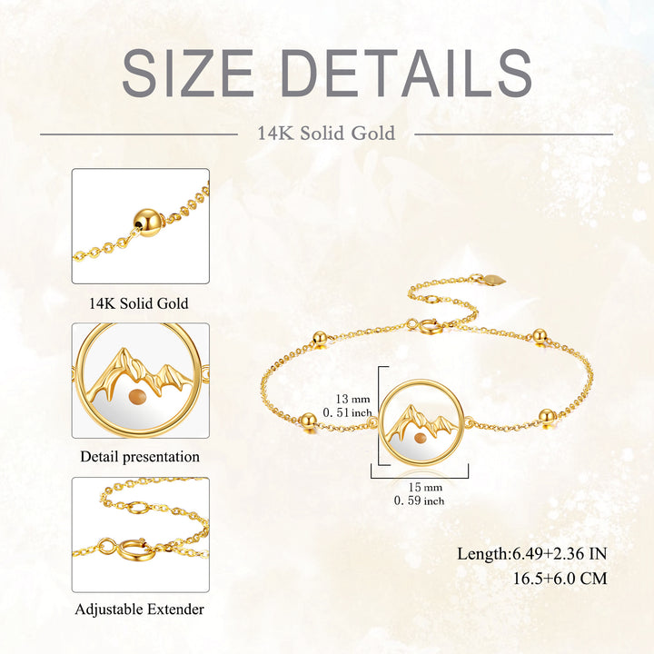 14K gold; mountain charms; mustard seed charms; bracelet design.