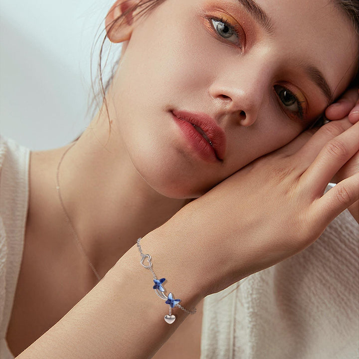 This Sterling Silver Blue Crystal Butterfly Star & Heart Charm Bracelet by YFN beautifully layers symbolic motifs in a feminine, white-gold plated design. The blue crystal butterfly adds vibrant sparkle while the heart charm brings sentimental warmth, creating a delicate bracelet crafted for women who enjoy expressive elegance.