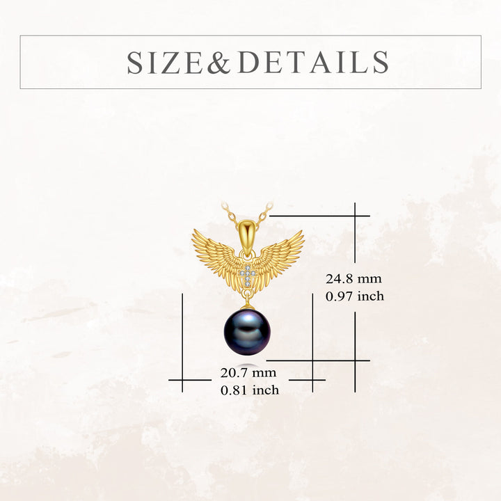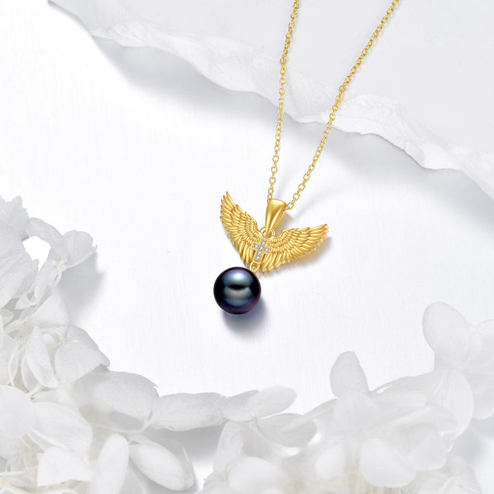 14K Gold Pearl Angel Wing Pendant Necklace for Women