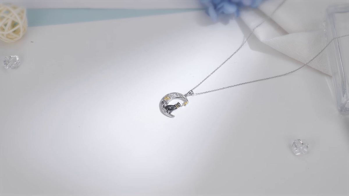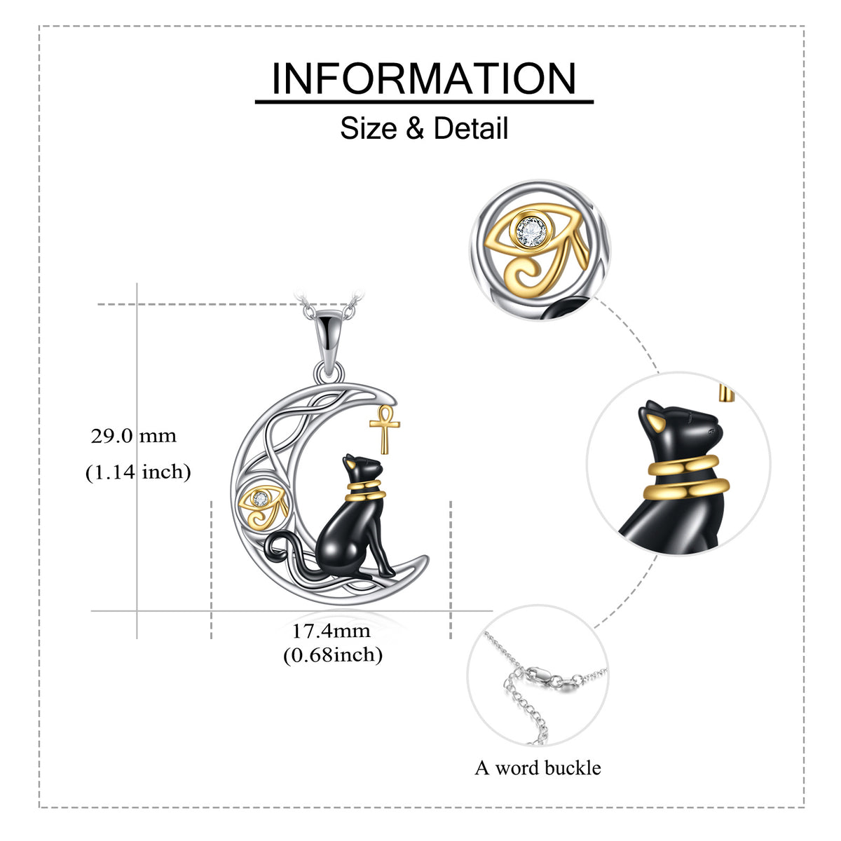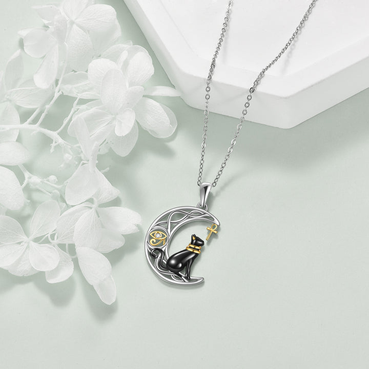 Sterling Silver Egyptian Bastet Cat Crescent Moon & Cross Necklace