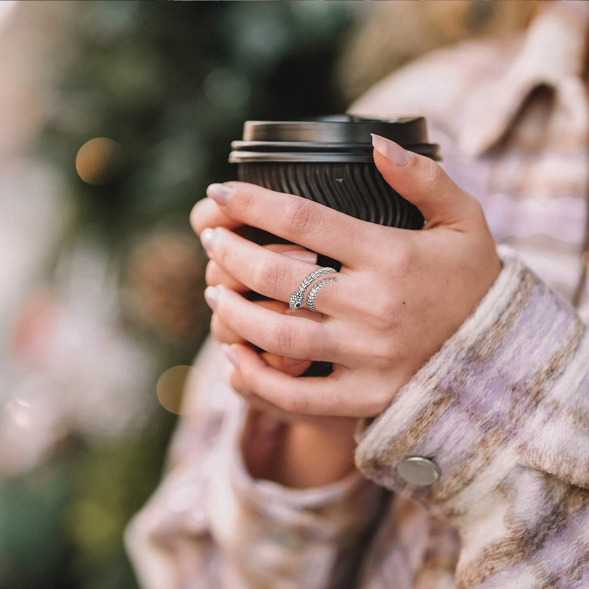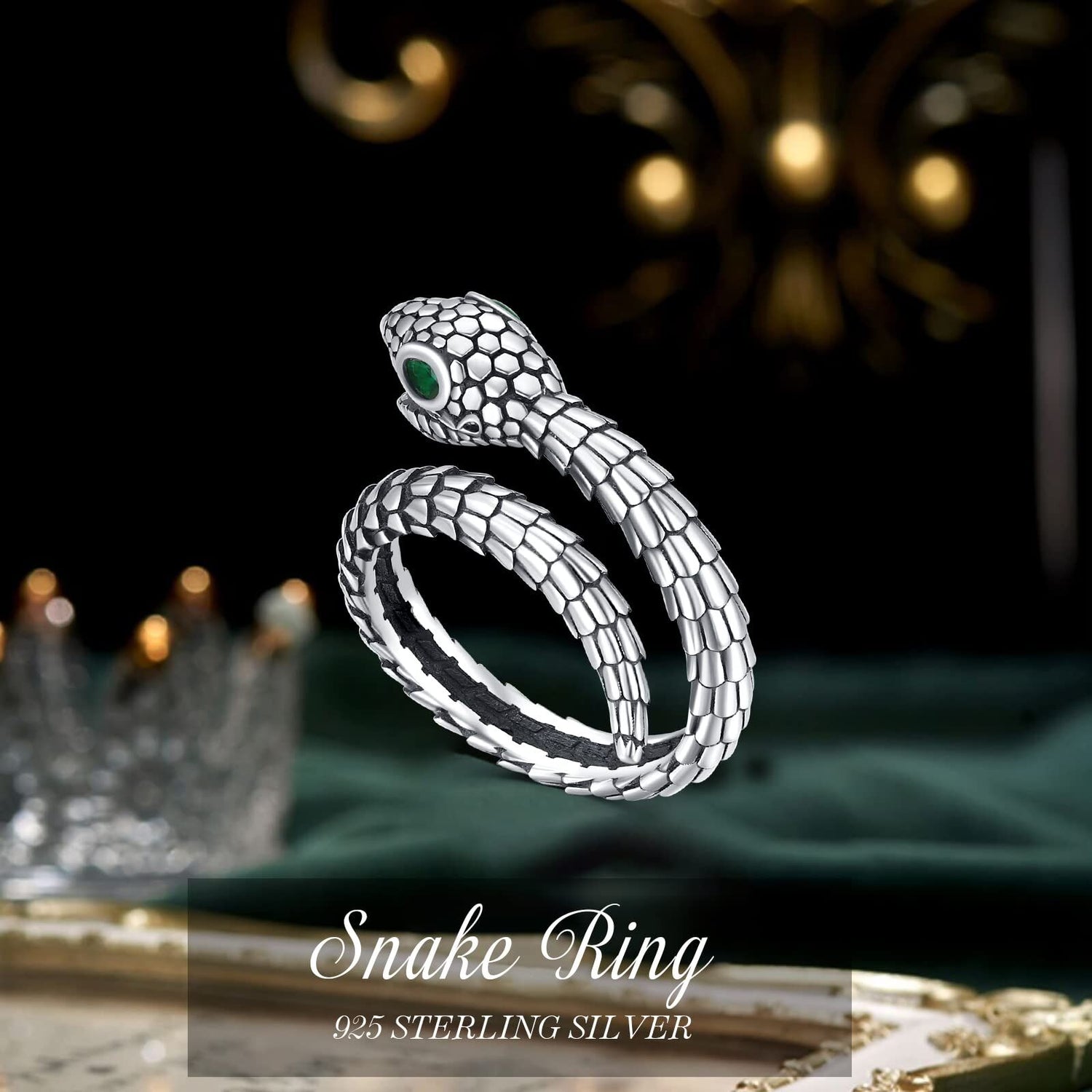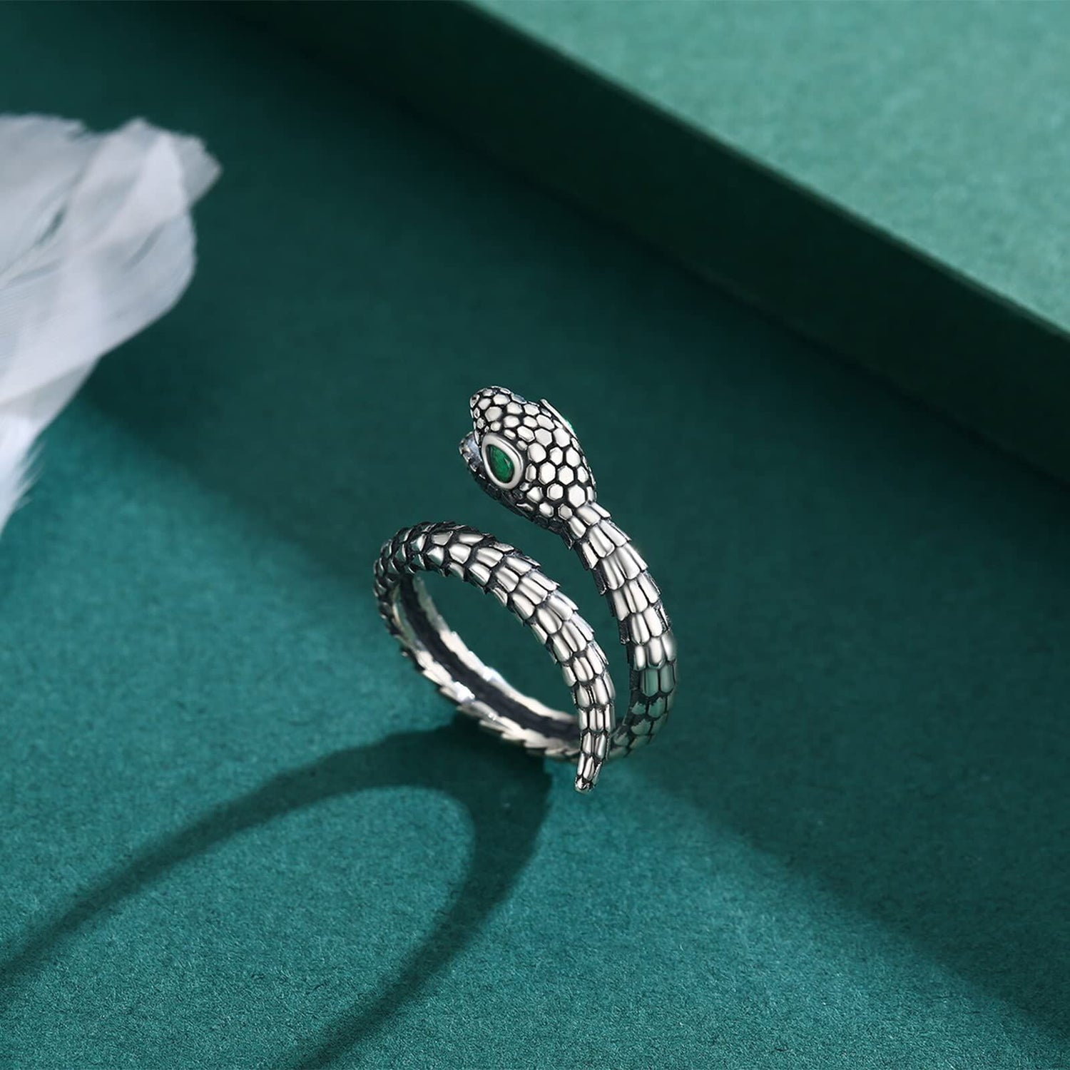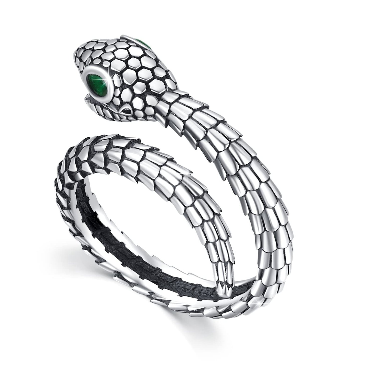 This Sterling Silver Round Shaped Cubic Zirconia Snake Open Ring by YFN combines symbolic meaning with striking design. The snake motif, representing transformation and wisdom, winds gracefully around the finger, accented by vivid green cubic zirconia. With its retro silver finish and open-ring structure, this unisex piece delivers bold sophistication.