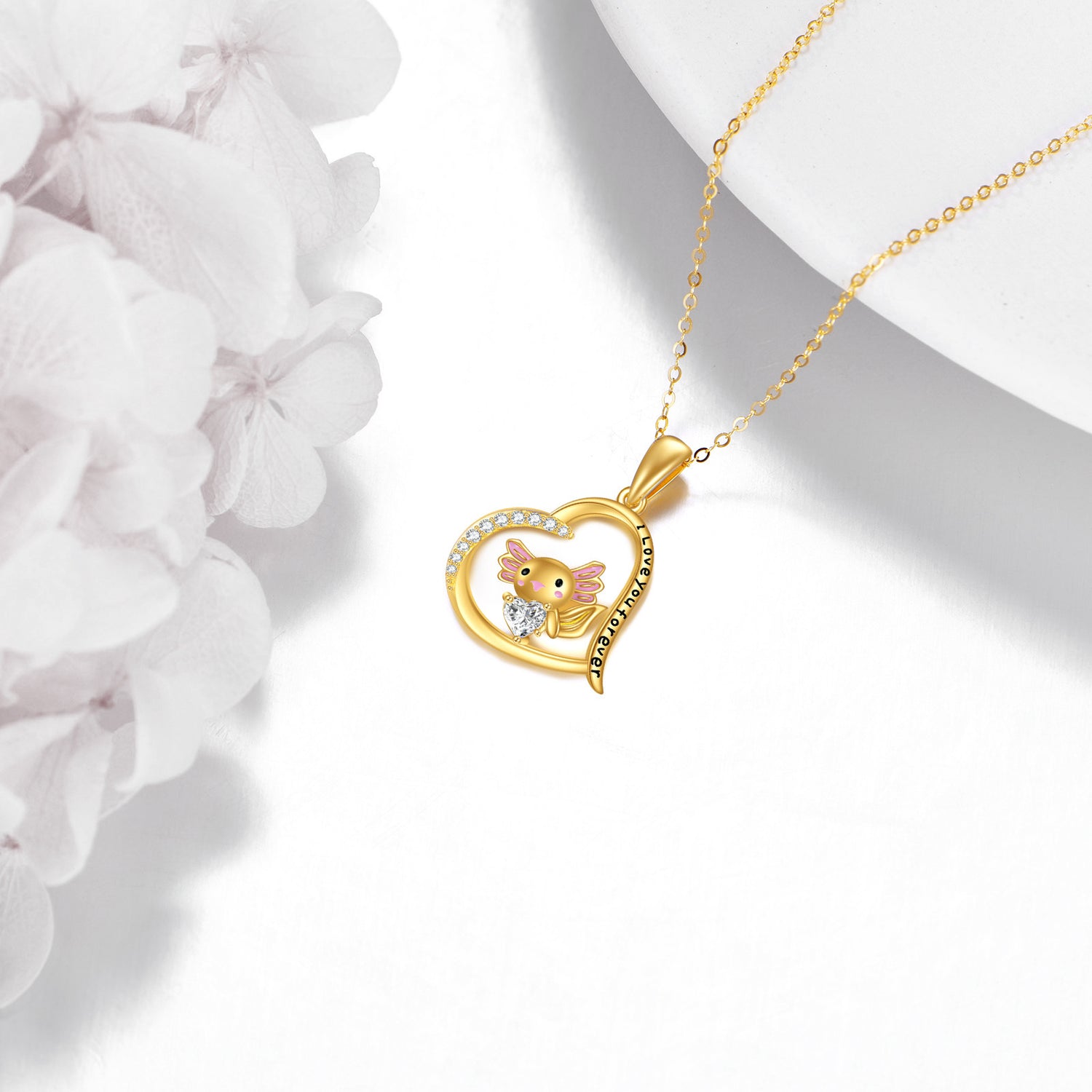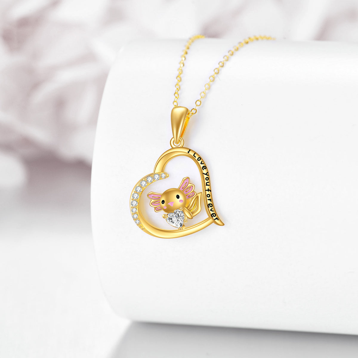 This Heart Pendant Necklace is crafted from High-Quality 14K Gold, Featuring a Dazzling Cubic Zirconia Axolotl Design with a Heart Motif, a Personalized Birthstone, and an "I Love You Forever" Engraved Message.