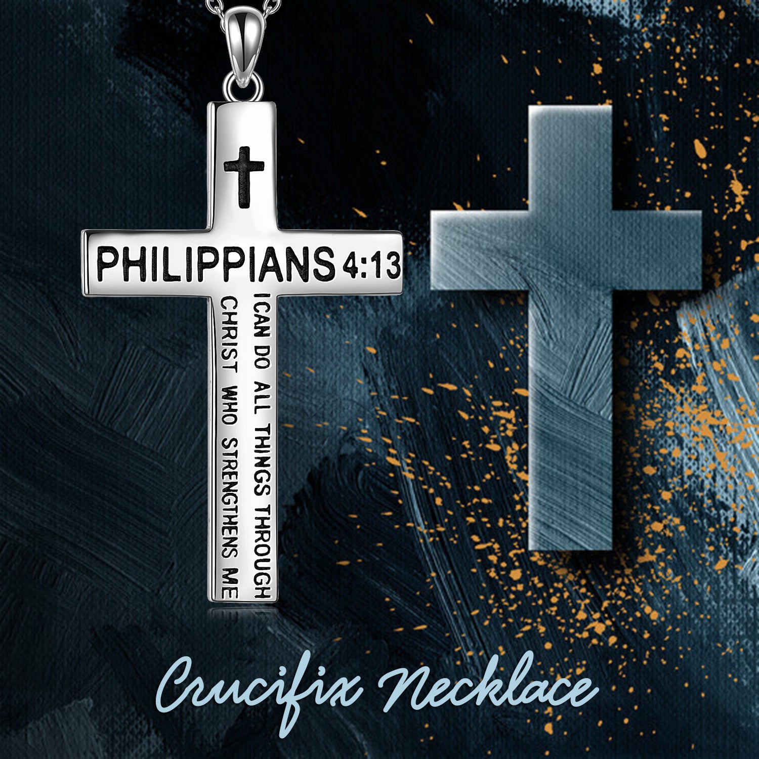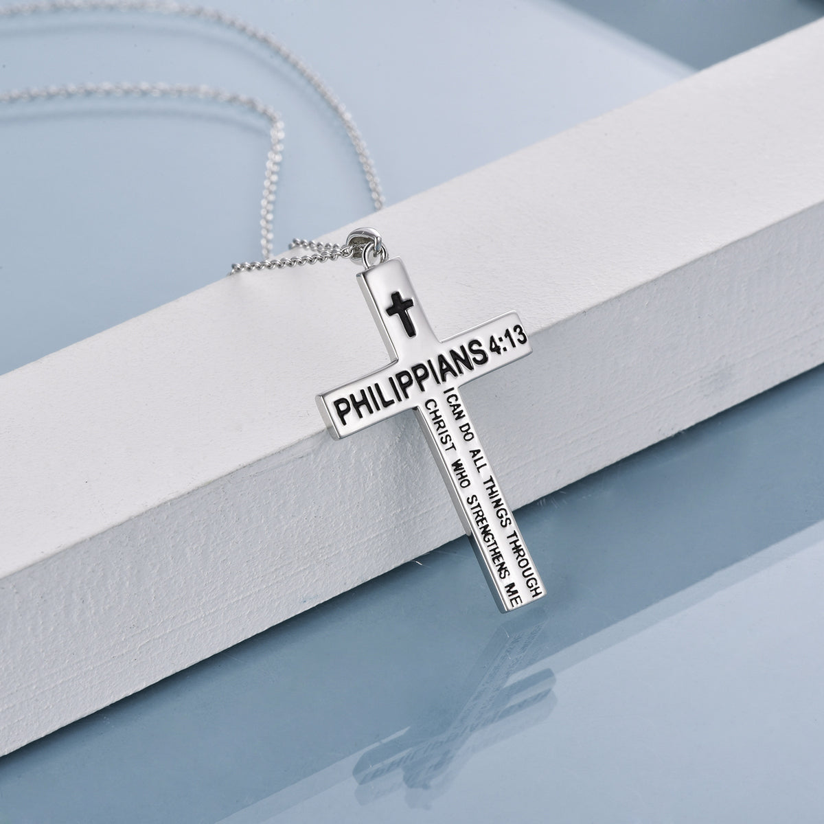 Crafted from Sterling Silver with White Gold Plating. This is a Pendant Necklace featuring a Cross design (no stones). Engraved with "I Can Do All Things Through Christ Who Strengthens Me."