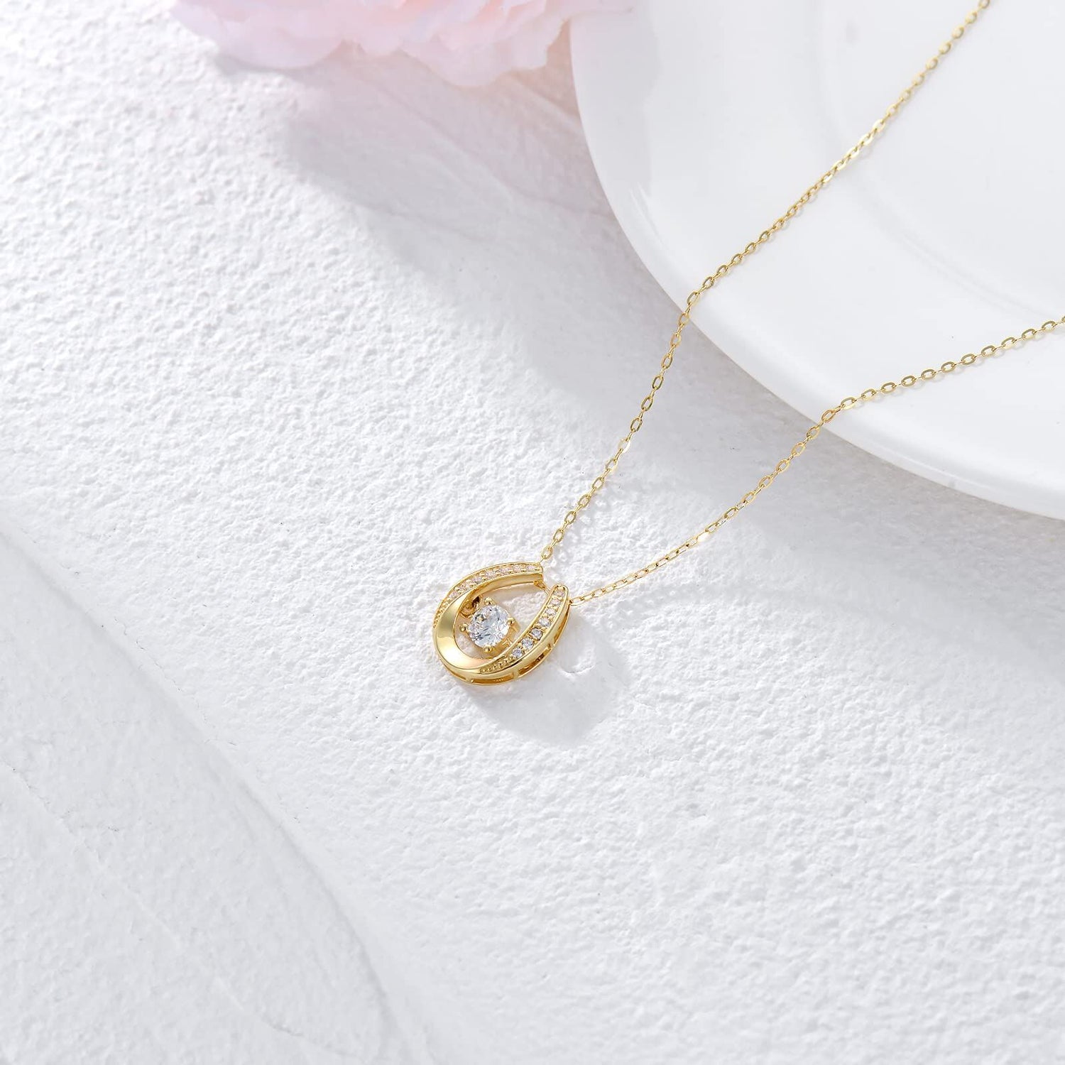 This 14K Gold Cubic Zirconia Horseshoe Pendant Necklace by YFN is an elegant and timeless piece, perfect for the woman who appreciates sophisticated style. Crafted with high-quality 14K gold, the necklace showcases a brilliantly clear Cubic Zirconia centerpiece set in a classic horseshoe design. Its radiant gold hue paired with the sparkling stone makes it an ideal accessory for elevating any outfit, offering a beautiful blend of contemporary charm and enduring quality for all occasions.