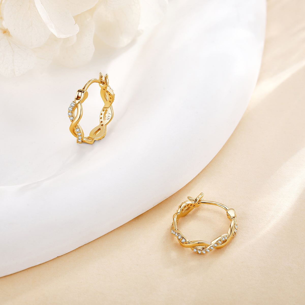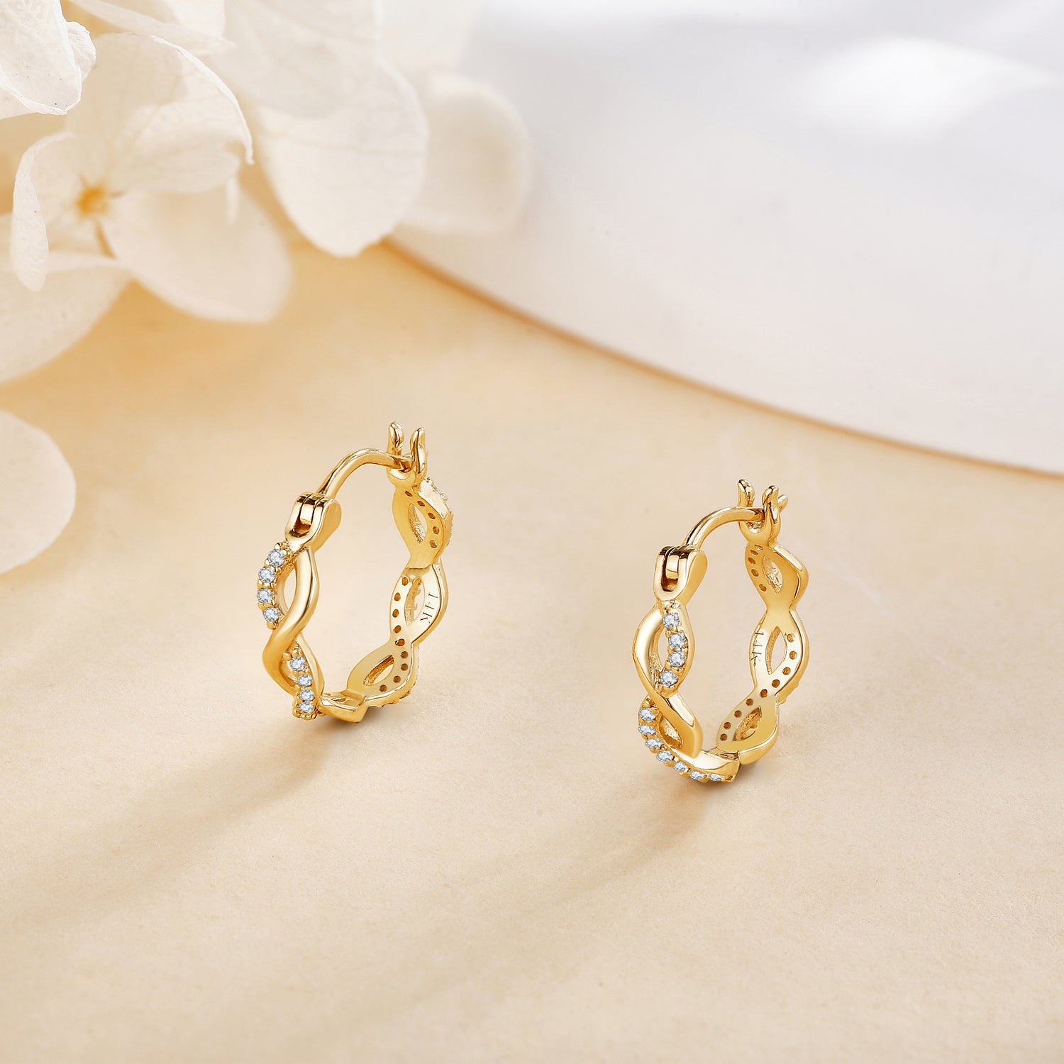 These Hoop Earrings are crafted from 14K Gold, Adorned with Sparkling Cubic Zirconia, Designed in an Infinity Symbol Shape.