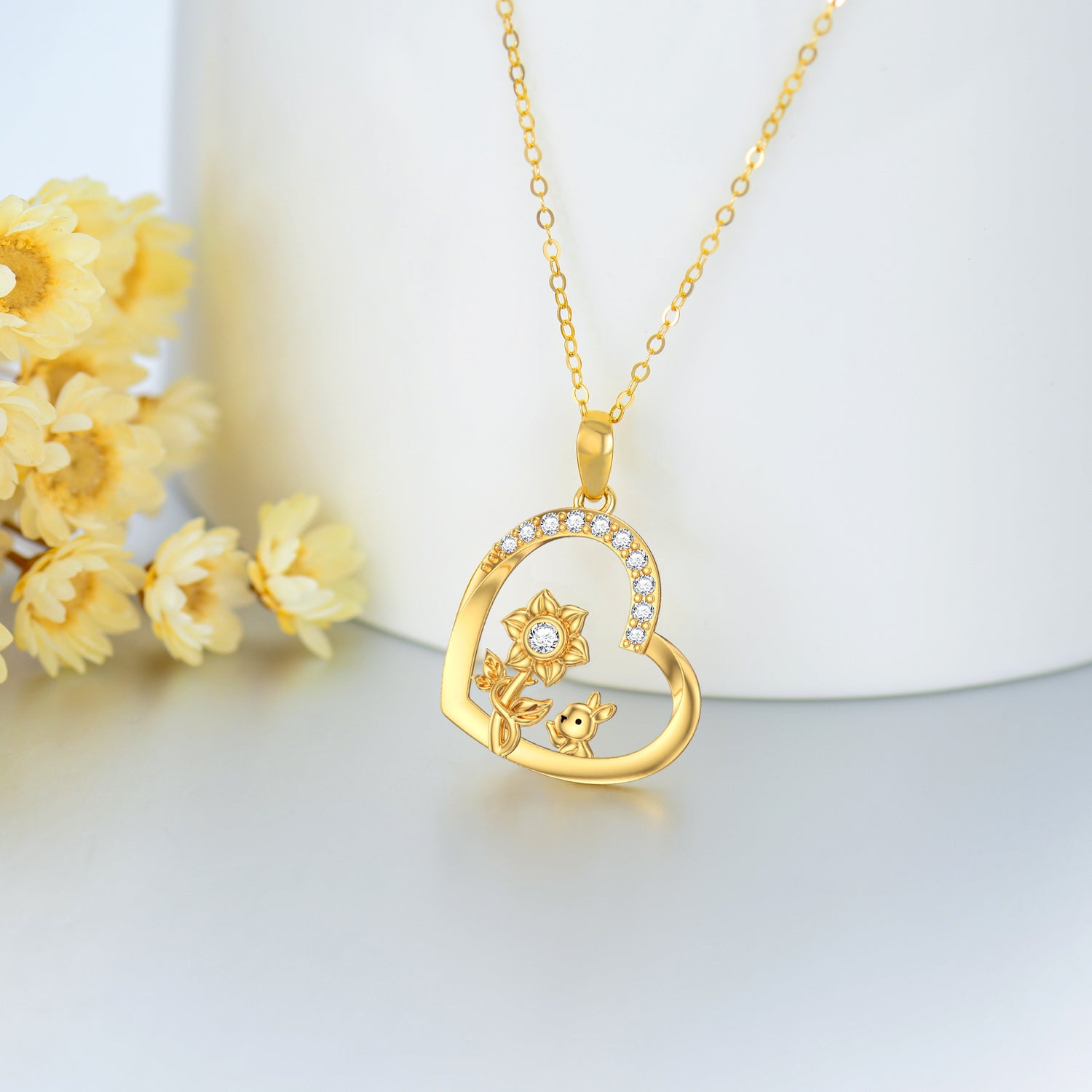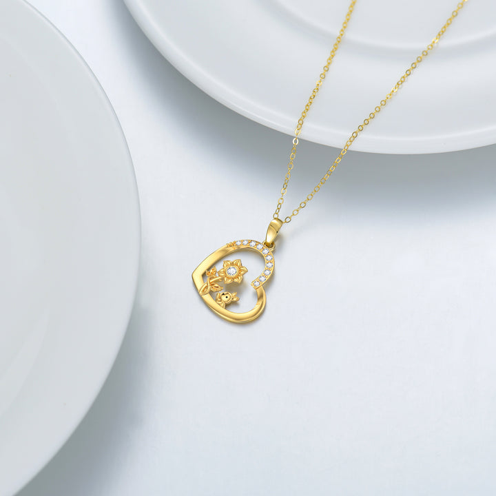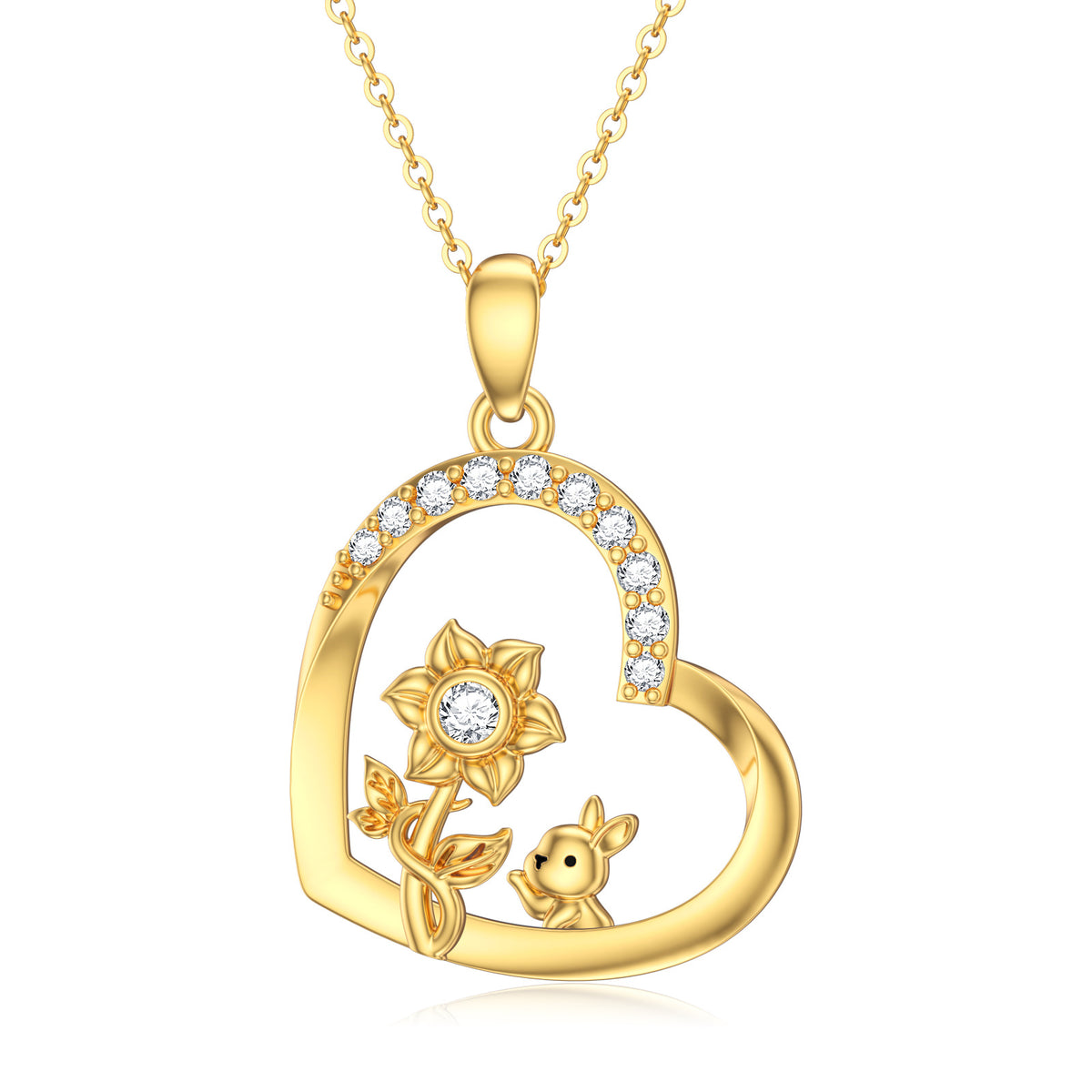 14K Gold Personalized Birthstone Rabbit Sunflower Heart Necklace for Women