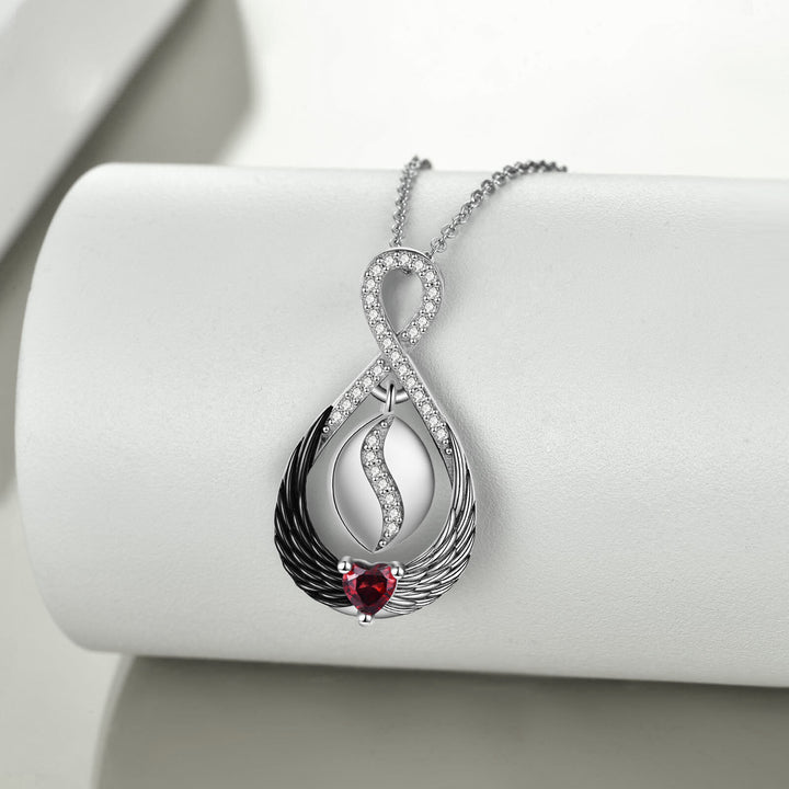 Cremation urn necklace crafted from sterling silver, featuring two-tone (silver and black) accents. Heart-shaped urn set with red cubic zirconia stones, detailed with an infinite symbol and angel wings. Pendant measures 1.25 inches by 0.85 inches on an 18-inch rolo chain with a spring-ring clasp.