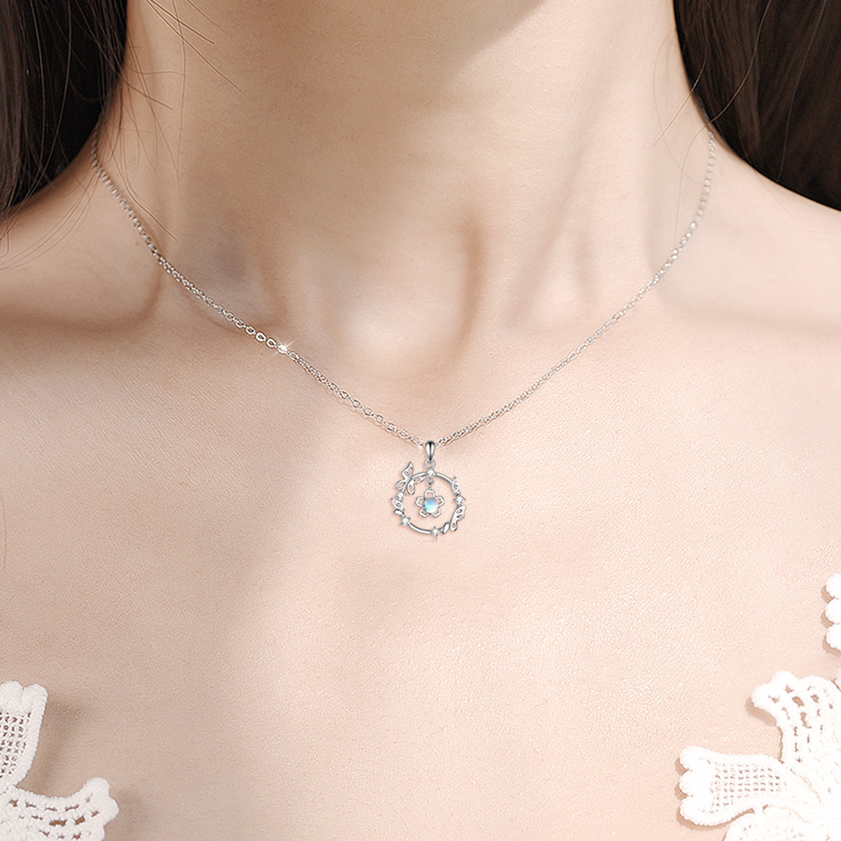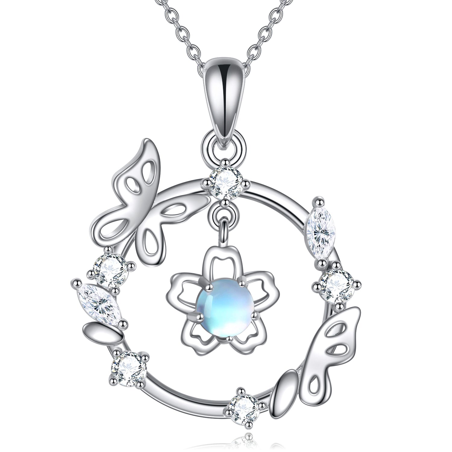 Sterling Silver Circle Moonstone Butterfly & Flowers Necklace for Women