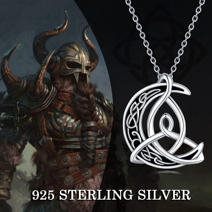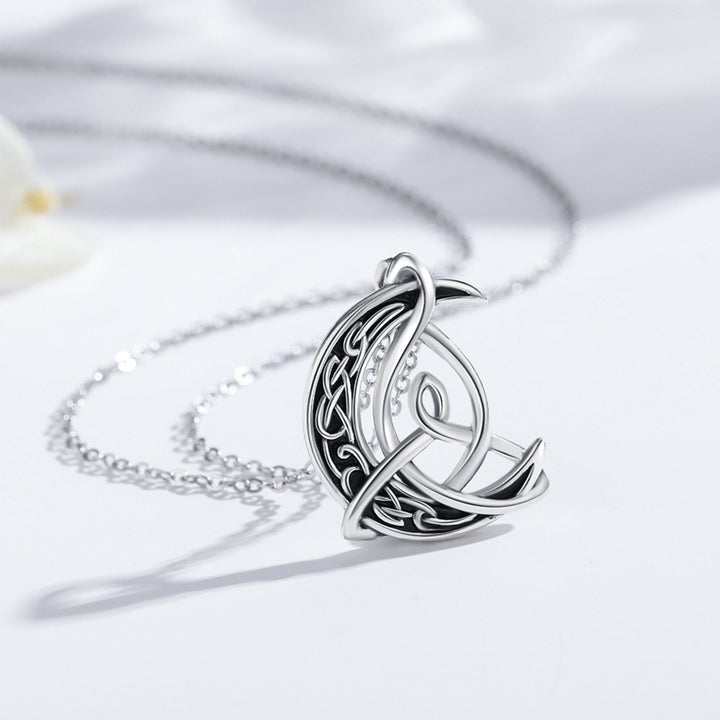 This pendant necklace is crafted from Solid 925 Sterling Silver with Black Accents, featuring a stone-free Celtic Knot and Moon motif.