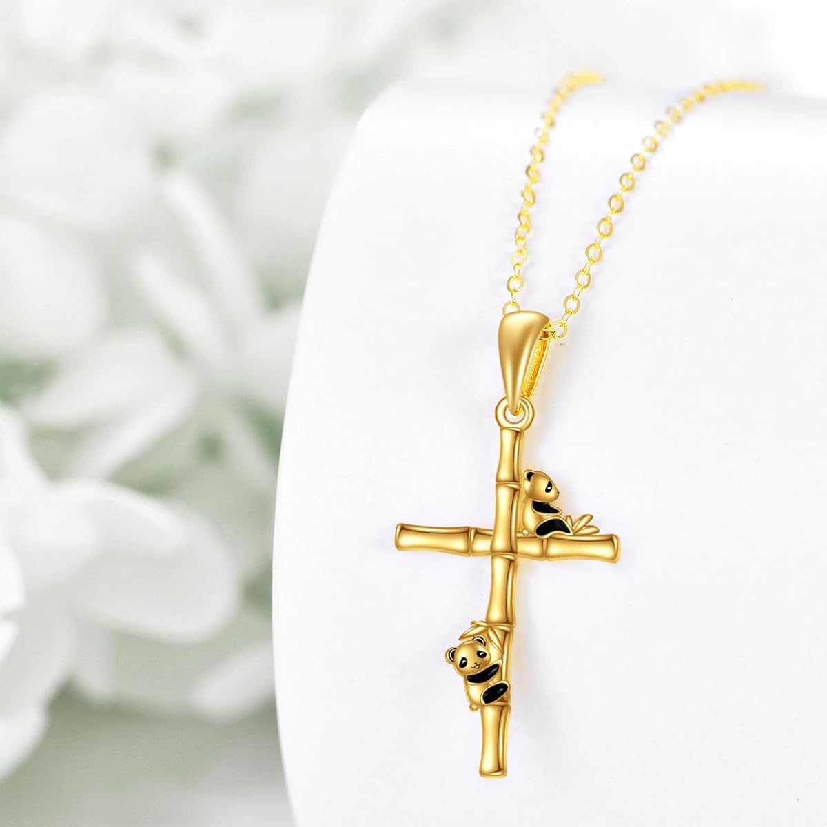 This pendant necklace is crafted from 14K gold. It features a stone-free design with a panda, bamboo, and cross motif, suspended from a matching gold chain.