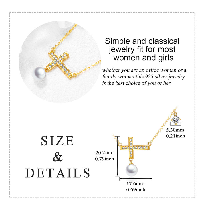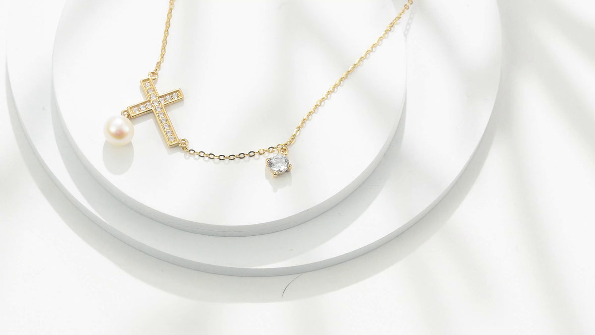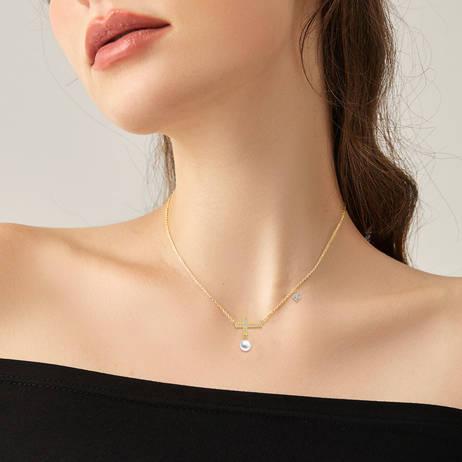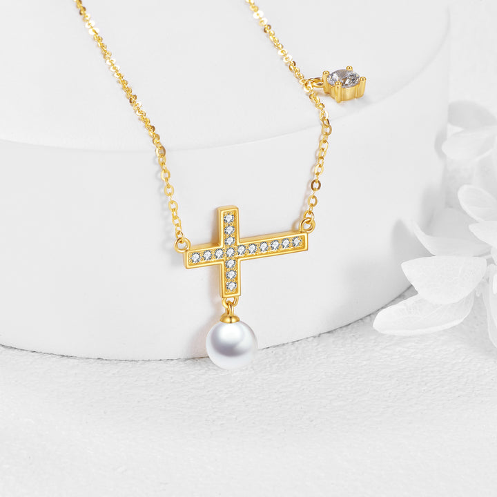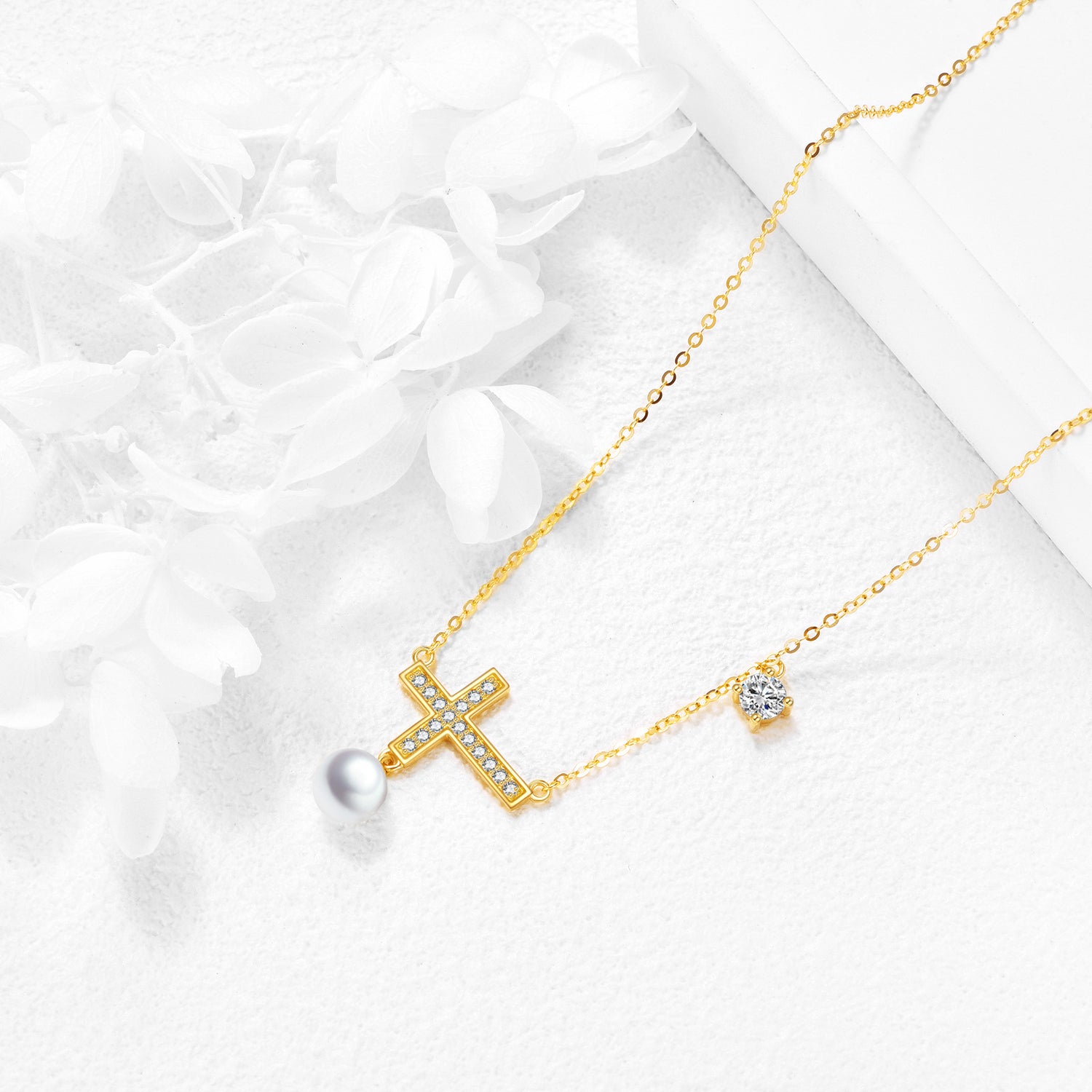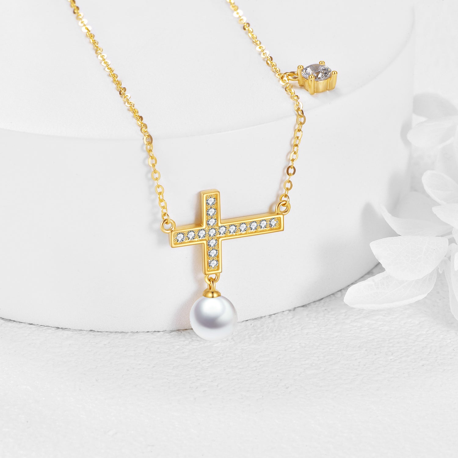 Crafted from solid 14K gold featuring cubic zirconia accents and a pearl set in a cross pendant design.