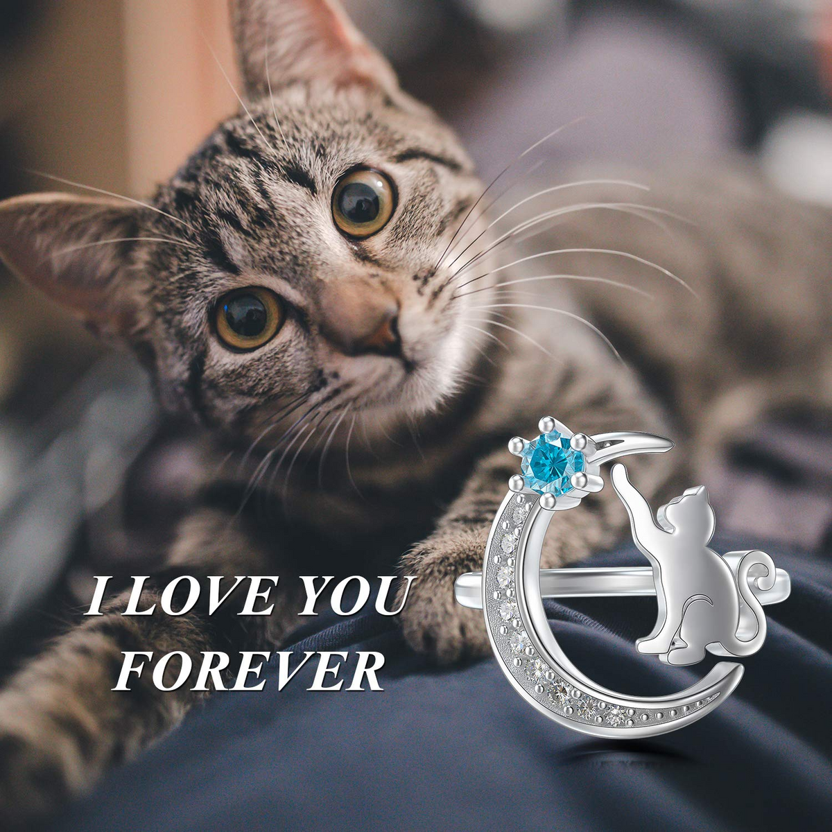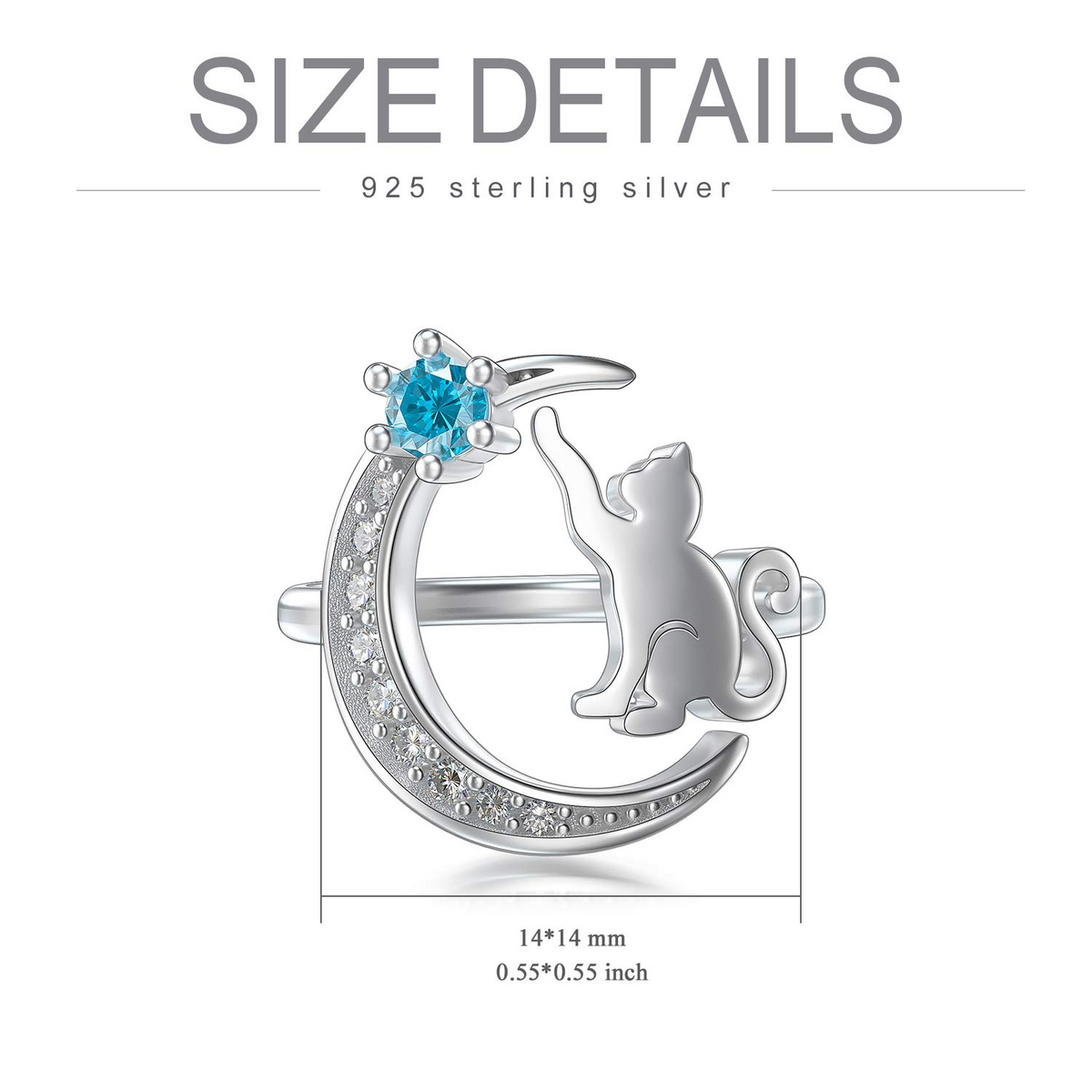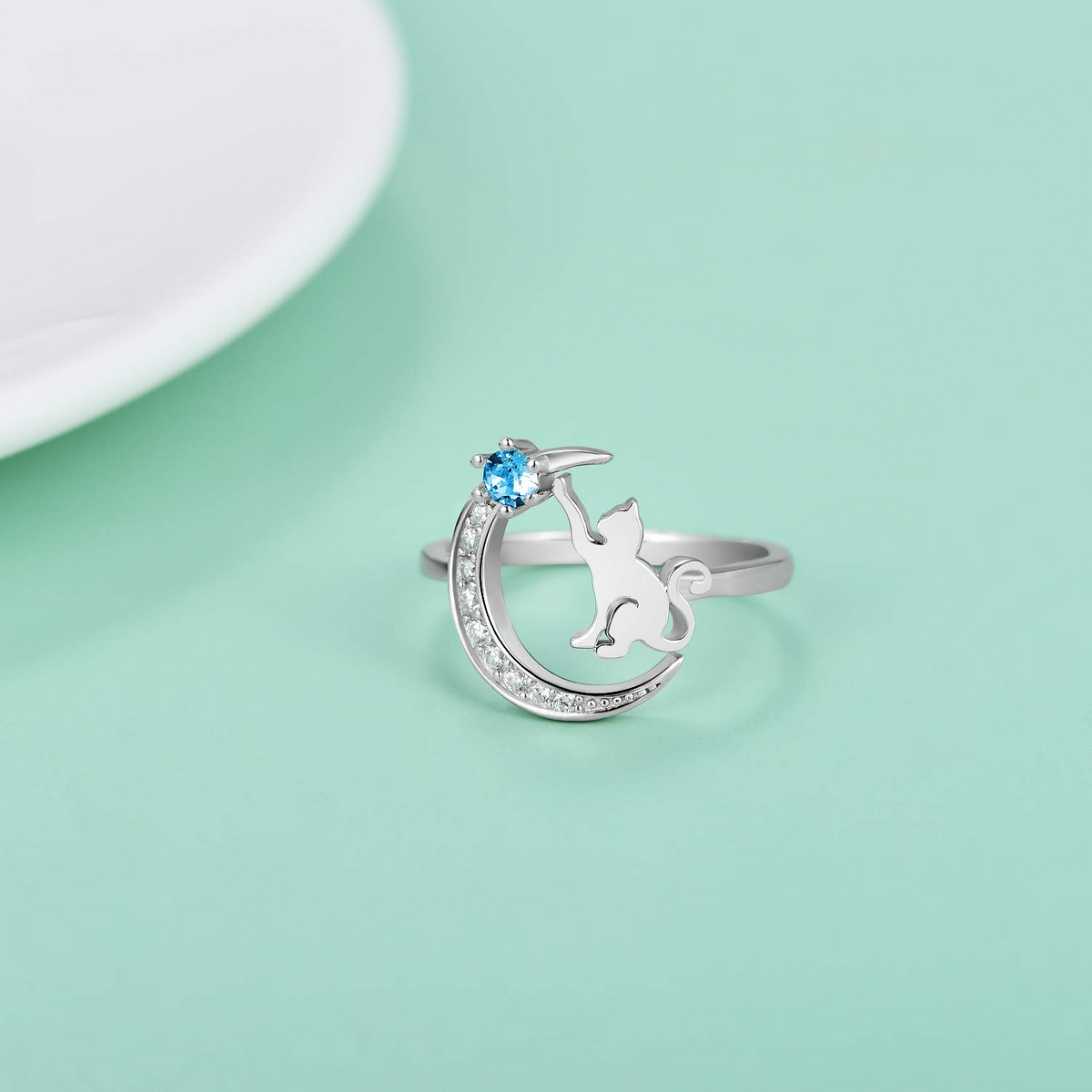This Open Ring is Crafted from Sterling Silver with White Gold Plating, featuring a Round Shape adorned with Dazzling Blue Cubic Zirconia and a Delightful Cat Design.