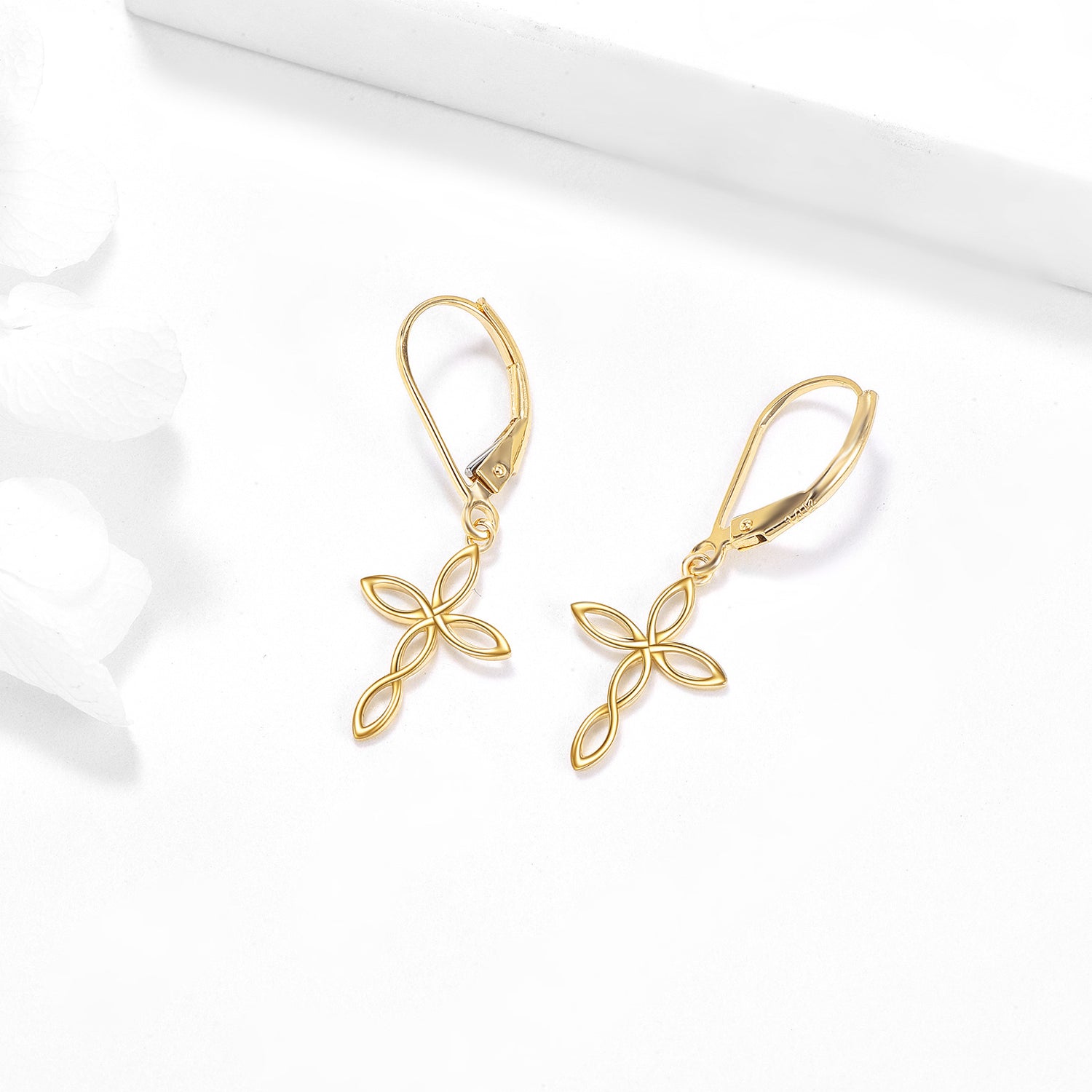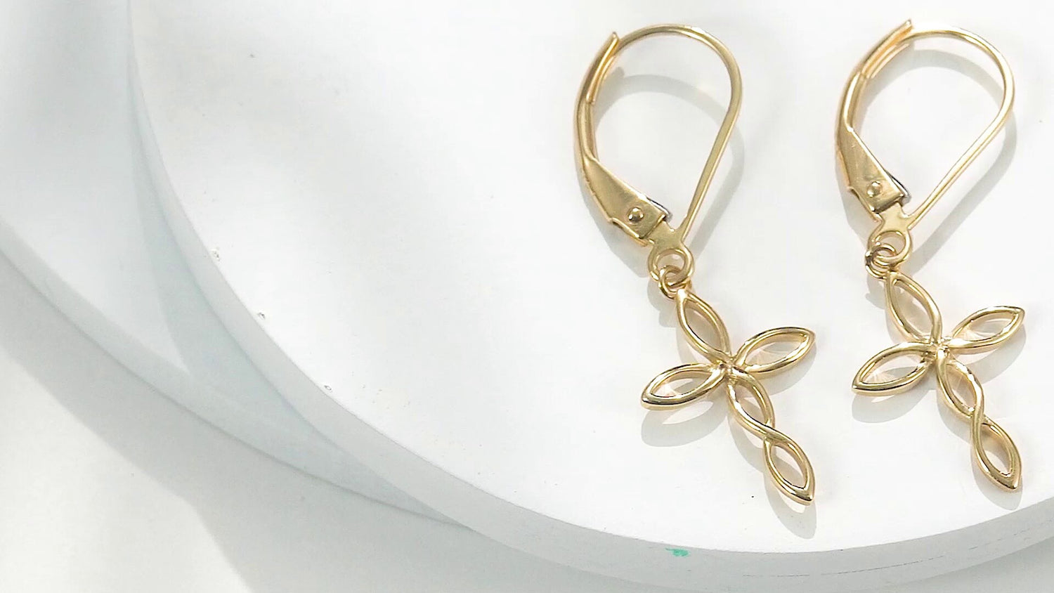 14K gold. Cross-shaped drop earrings. Lightweight, stone-free design.