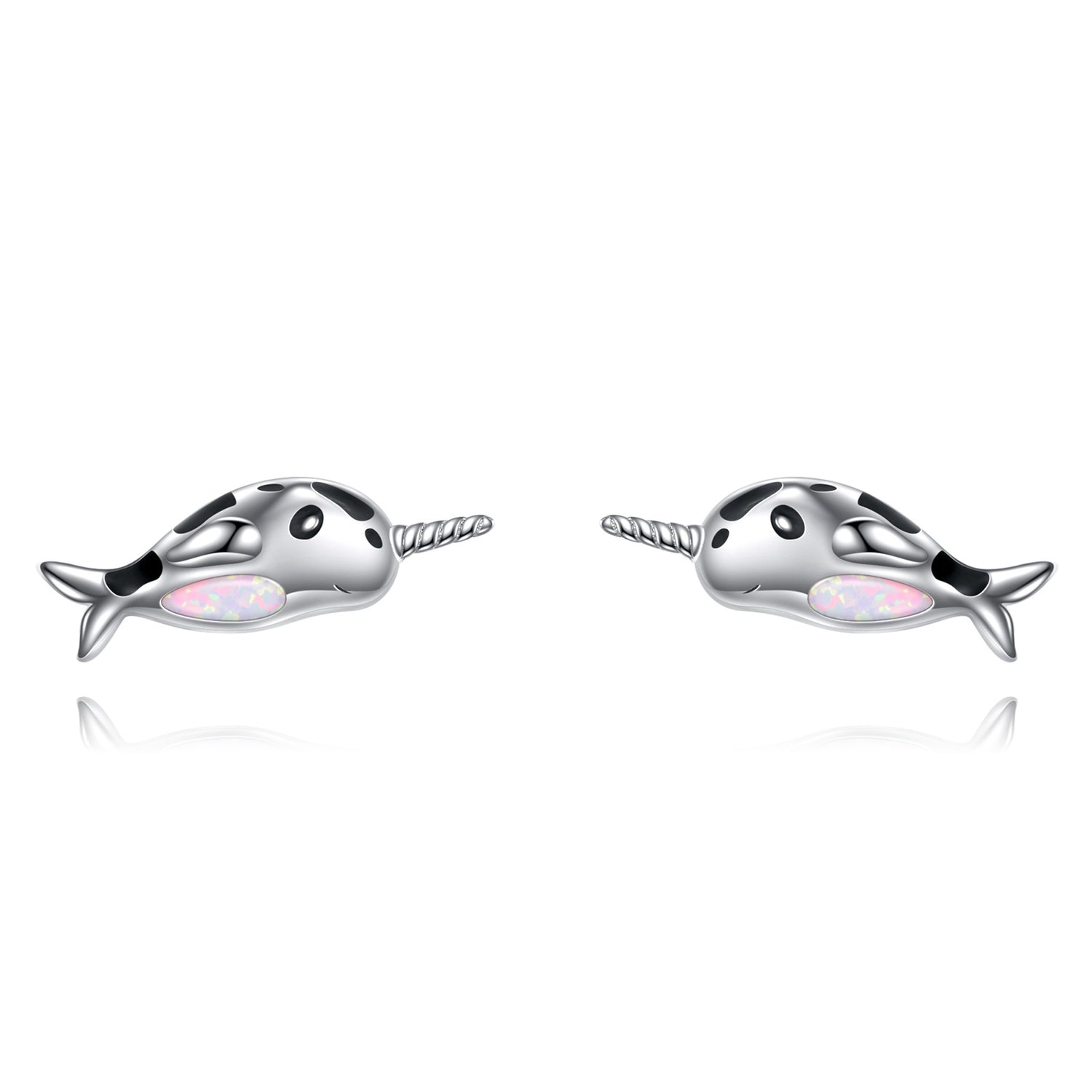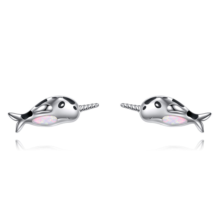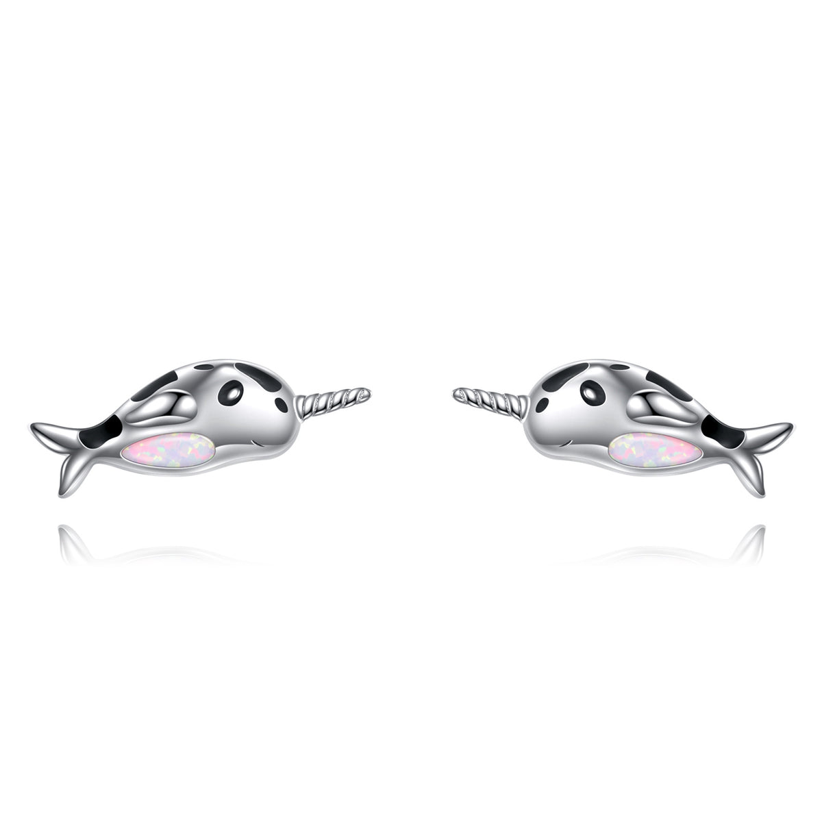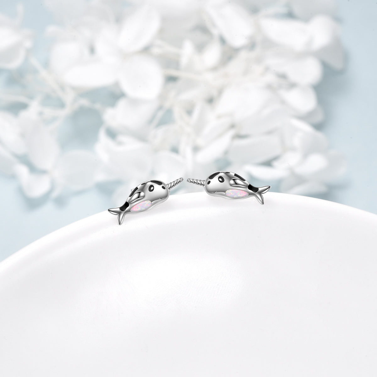 Made of sterling silver with white gold plating, featuring pink opal inlays in narwhal-shaped studs. Stud-post construction; measurements per brand.