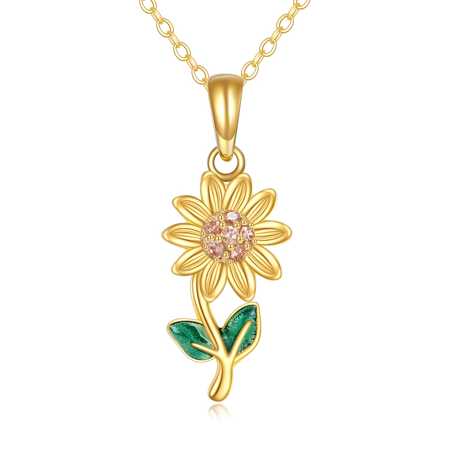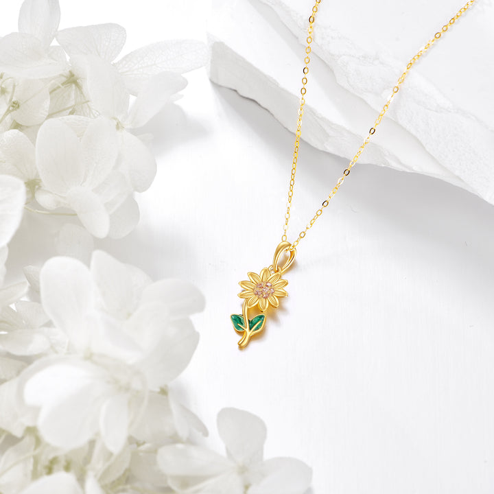 14K Gold Pink Cubic Zirconia Sunflower Pendant Necklace