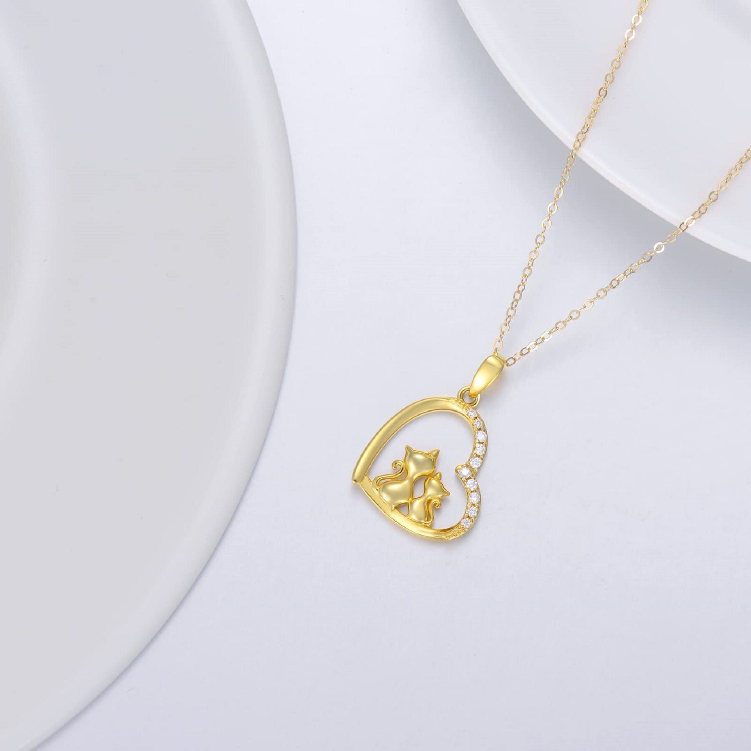 14K Gold Moissanite Cat & Heart Pendant Necklace