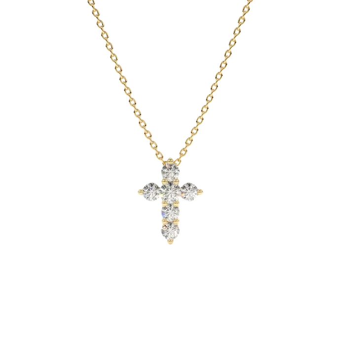 Crafted in 10K gold with 0.2 CT lab-created diamonds (D color, VVS clarity). Cross pendant with matching chain.
