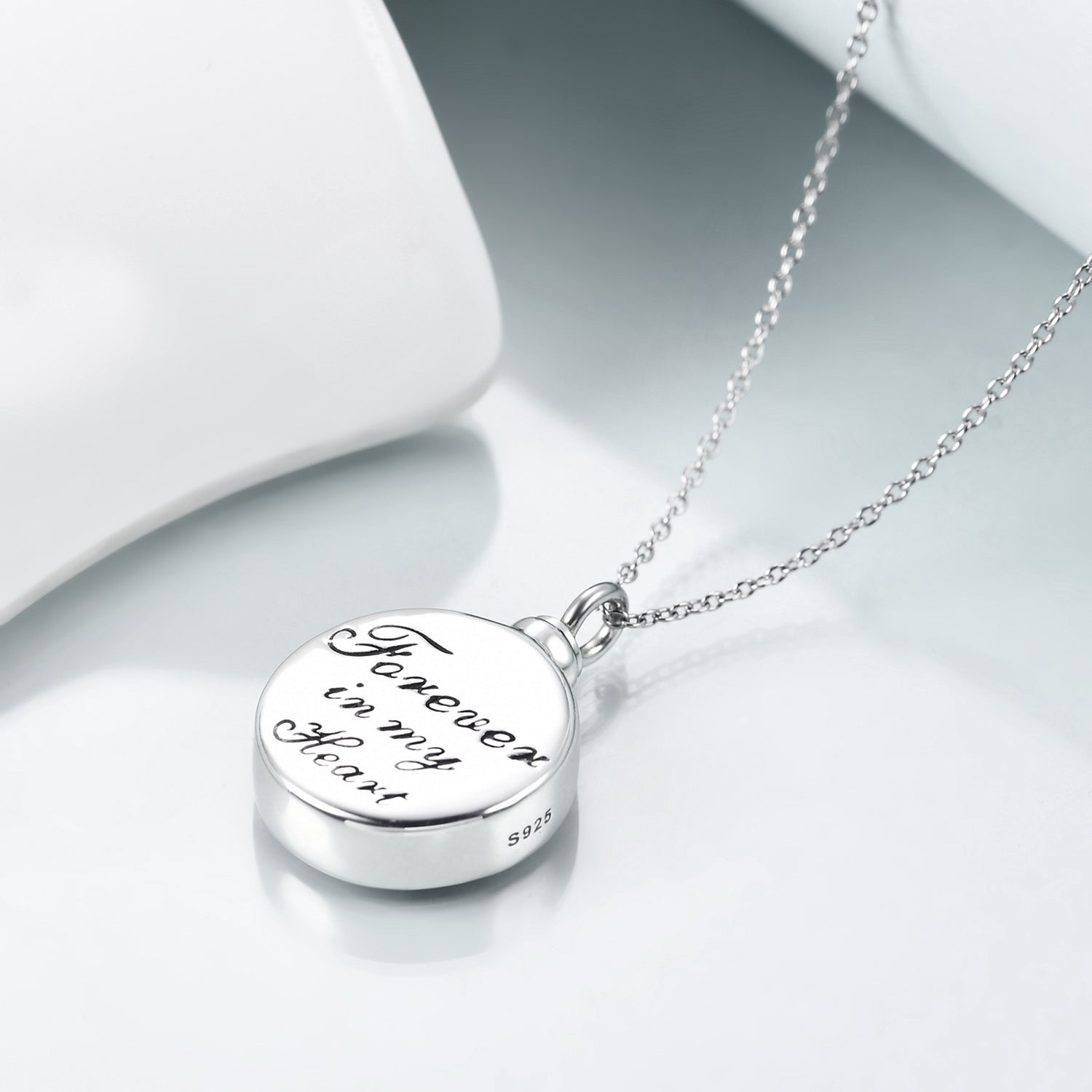 This no-stone Urn Necklace for Ashes is a Retro Silver Piece Crafted from Sterling Silver, featuring a Wolf & Sun Motif and Engraved with "Forever In My Heart."