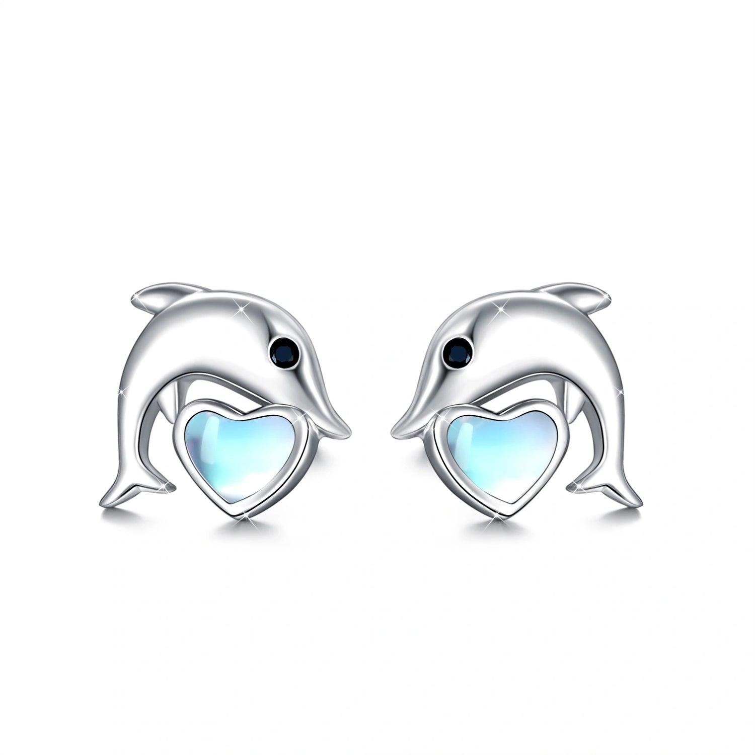 Sterling Silver Moonstone Dolphin & Heart Stud Earrings