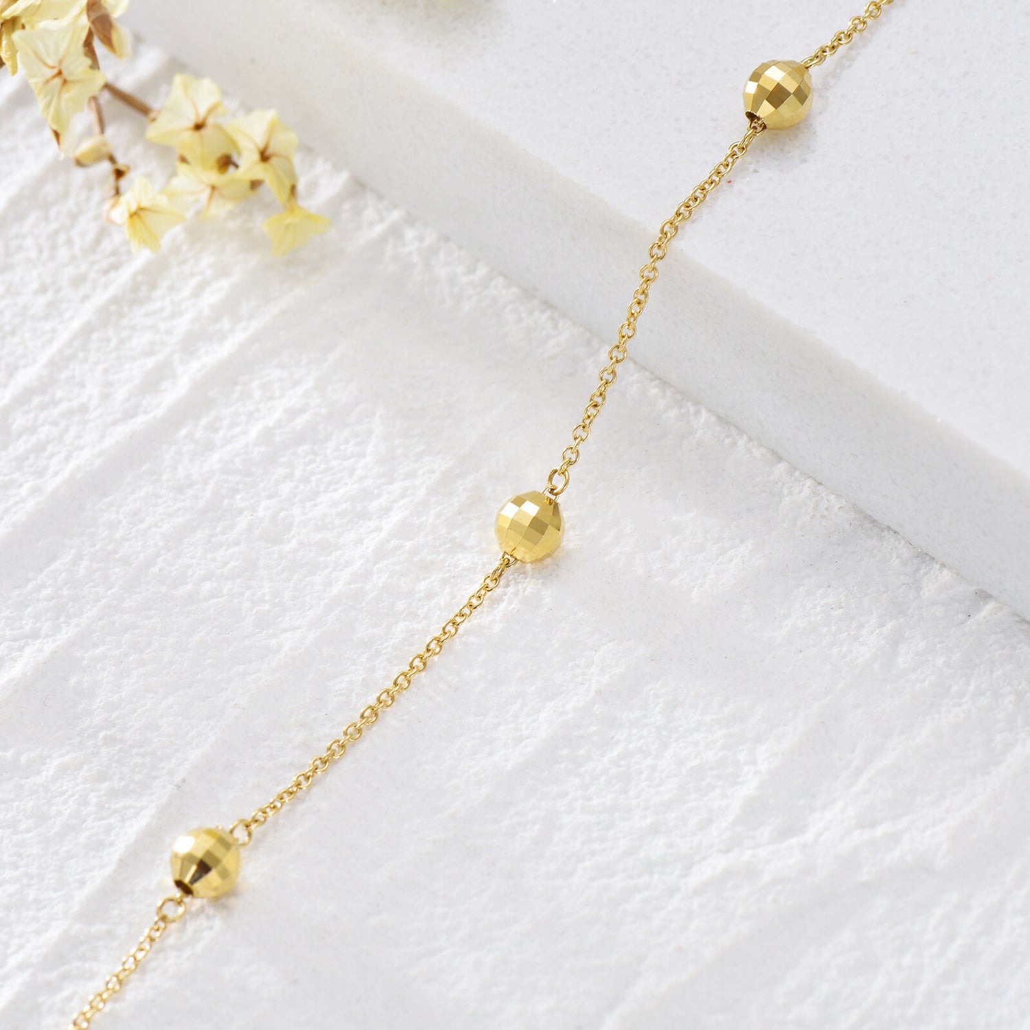 This 14K Gold Bead Bead Station Chain Bracelet For Women by YFN is an exquisite charm bracelet for women, embodying understated luxury. Crafted from high-quality 14K Gold, this no-stone bracelet features a delicate bead station chain design. Its classic yet contemporary look makes it a versatile accessory, perfect for a minimalist statement or layering with other pieces.