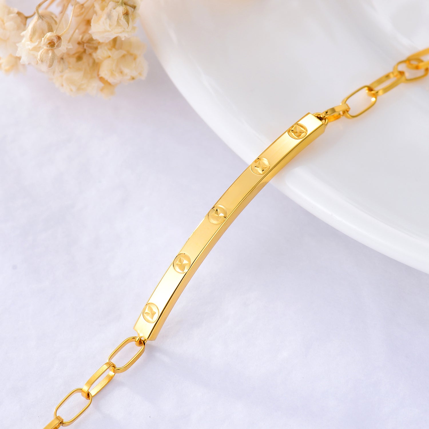 Crafted from high-quality 18K Gold, this stone-free Charm Bracelet features a sleek Bar design.