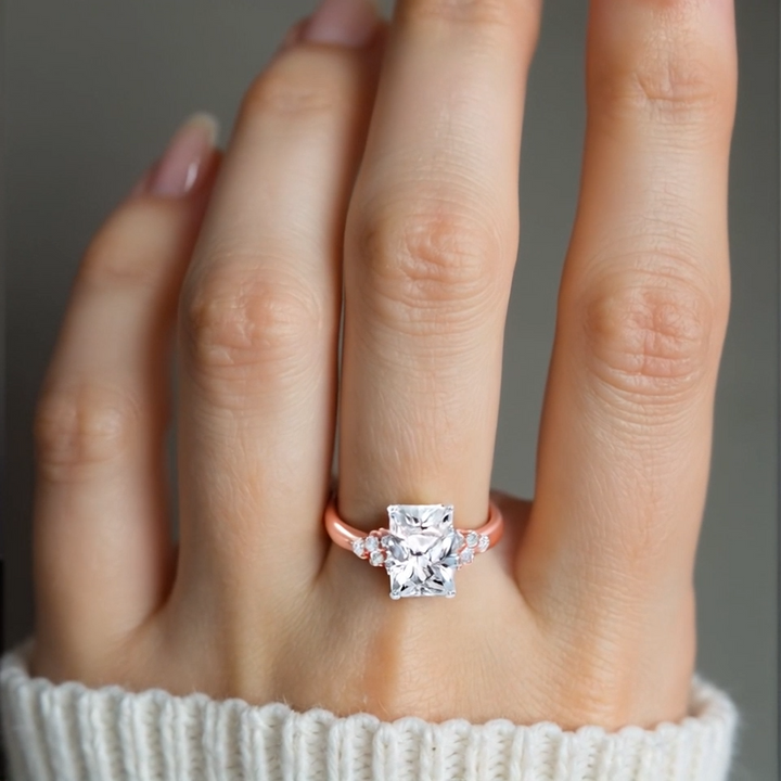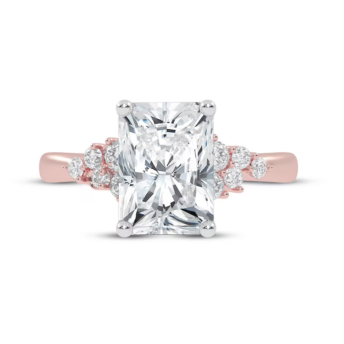 Crafted in 14K rose gold with lab-created diamonds (0.75–3.25 ct.t.w.), D color, VVS1–VS1 clarity. Emerald-cut center stone. IGI certified. Ring measurements per manufacturer.