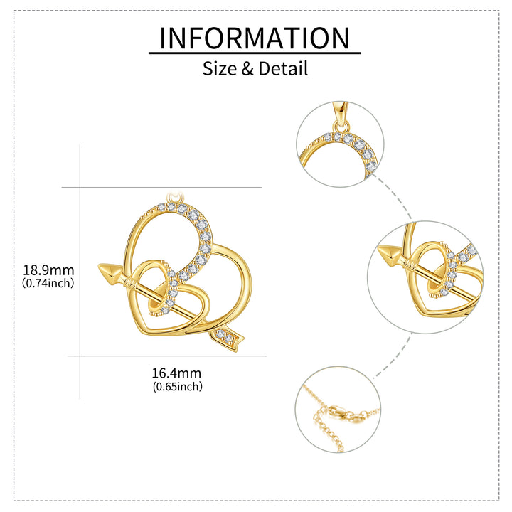 Crafted in 14K yellow gold with cubic zirconia. Features circular pendant with arrow-and-heart motifs. Includes coordinating chain with secure clasp.