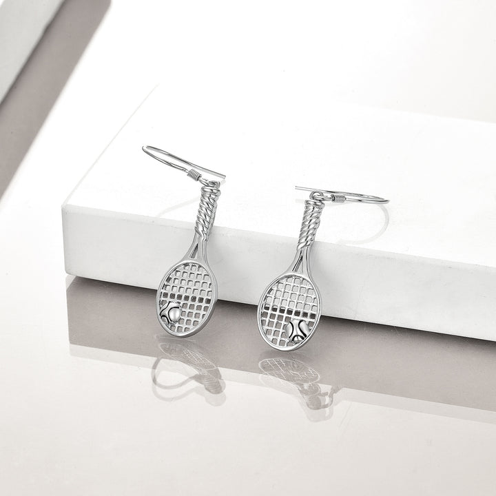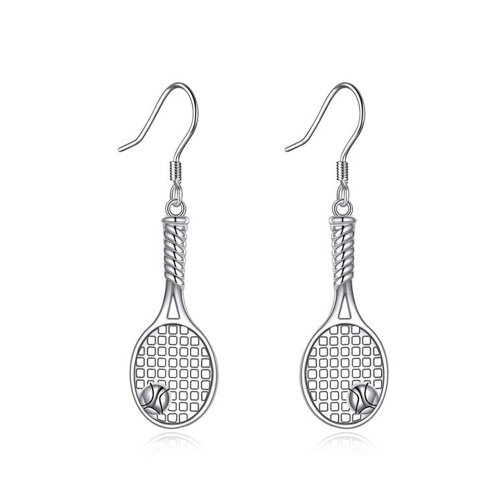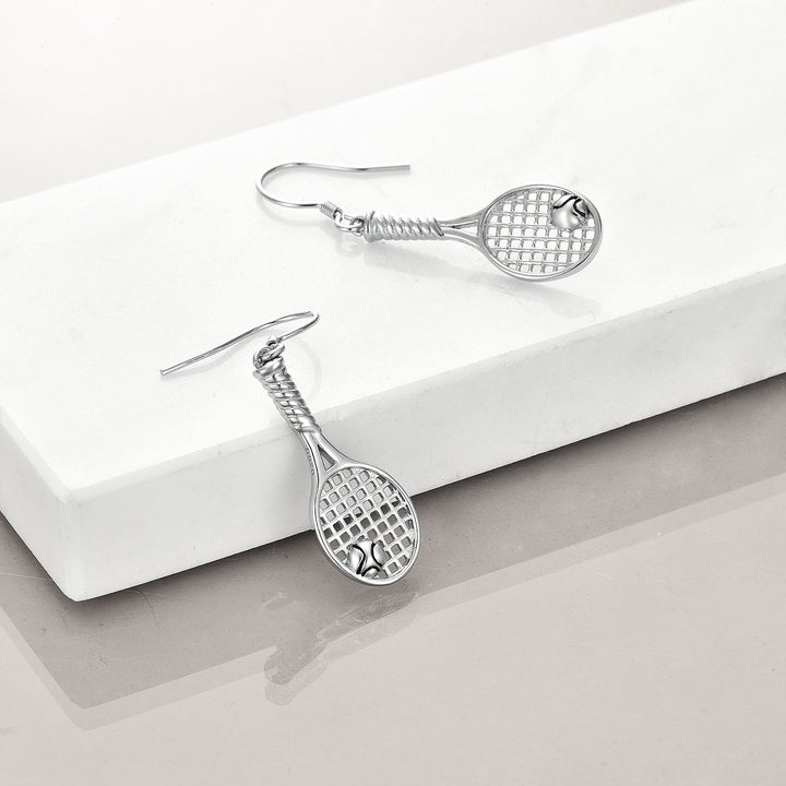 These Sterling Silver Tennis Racket Drop Earrings by YFN elevate sporty elegance with their polished white gold plated finish. The tennis-inspired silhouette adds playful sophistication, making them a unique accessory for women who enjoy understated design without gemstones.