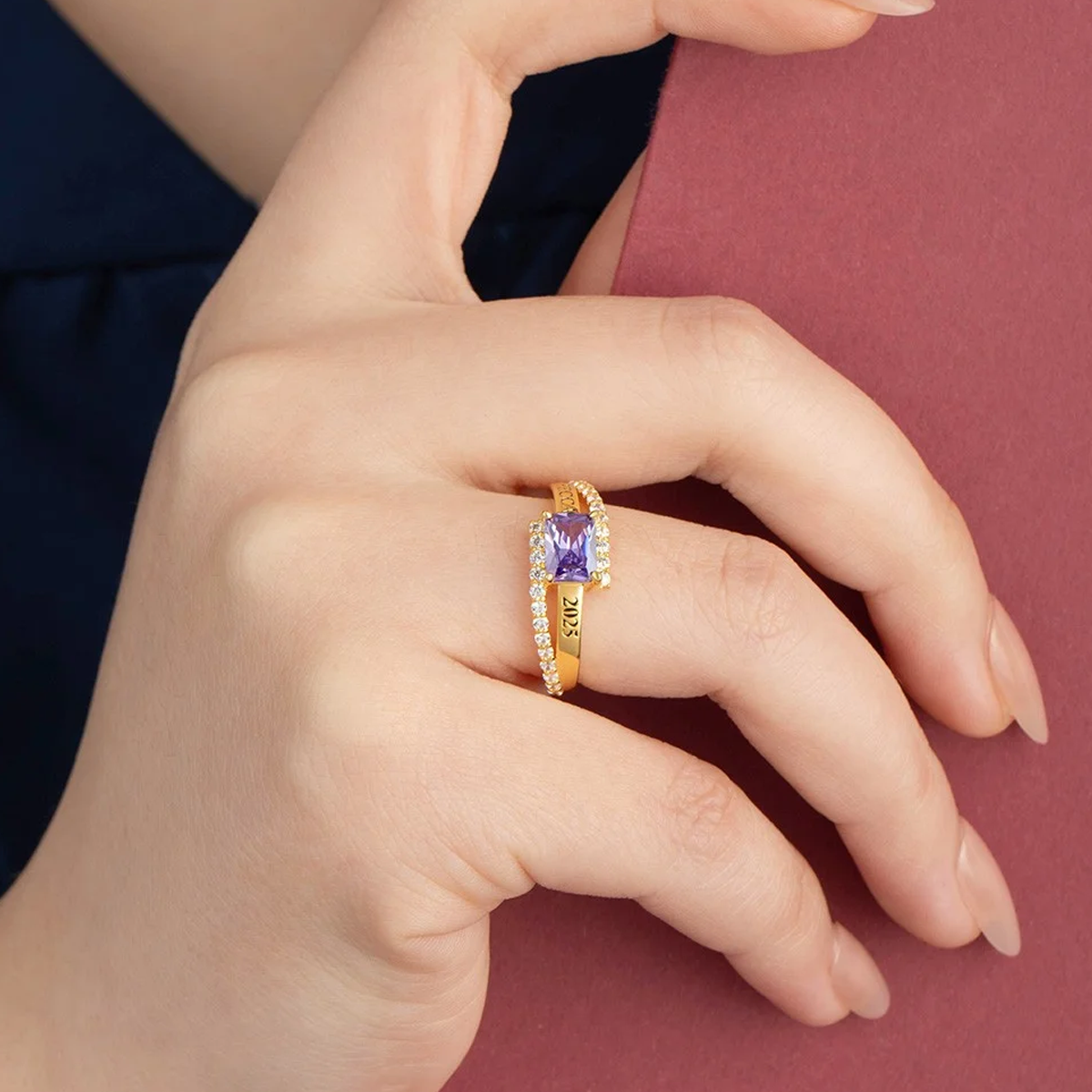 14K Gold Personalized Engraved Graduation Ring with Square Birthstone, High School University Class Ring