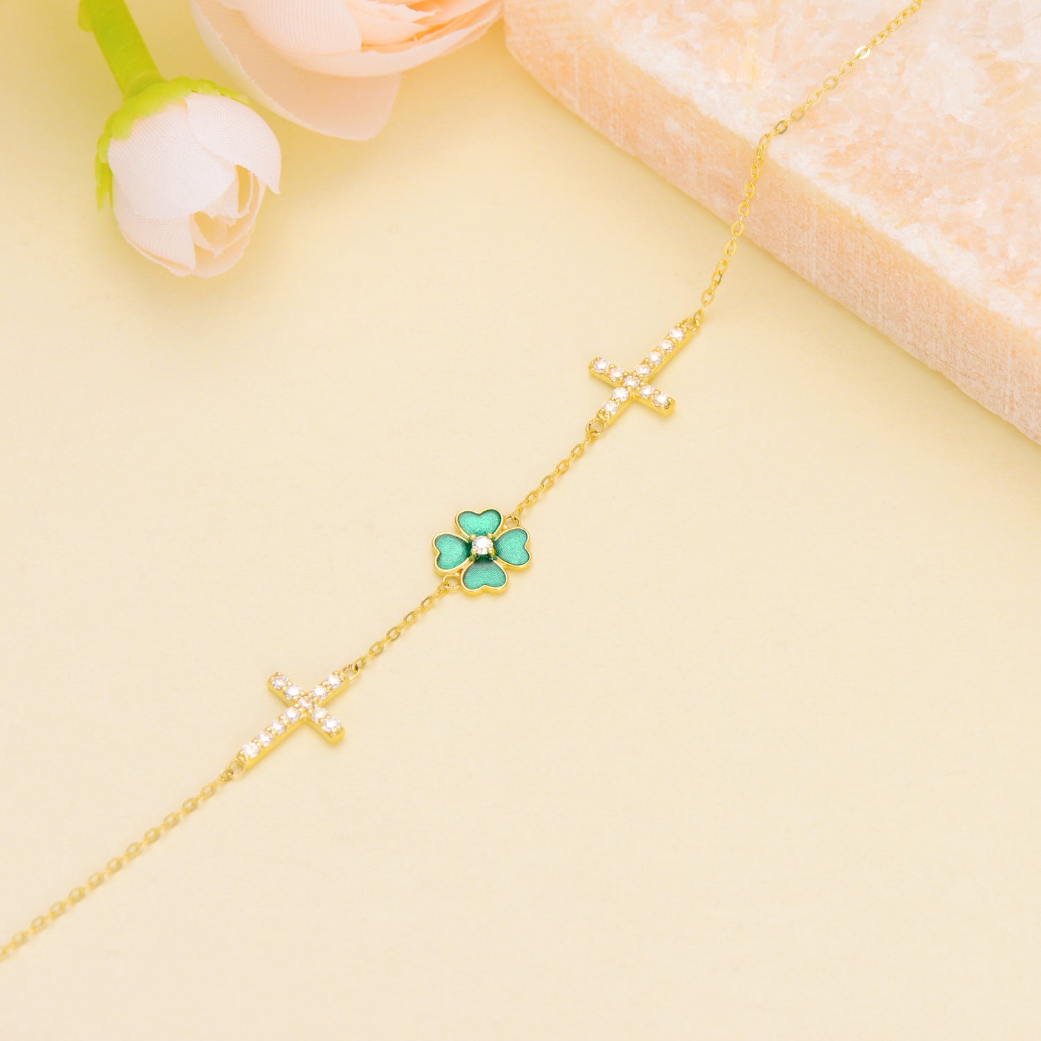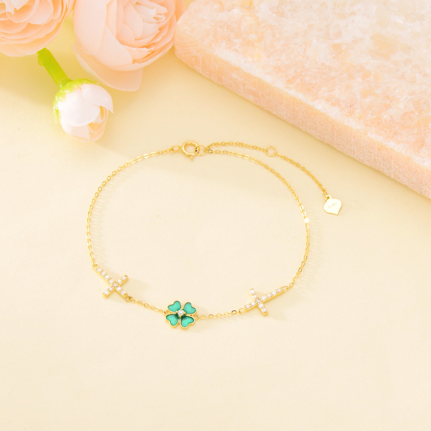 10K Gold Circular Shaped Moissanite Four Leaf Clover Charm Bracelet