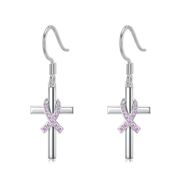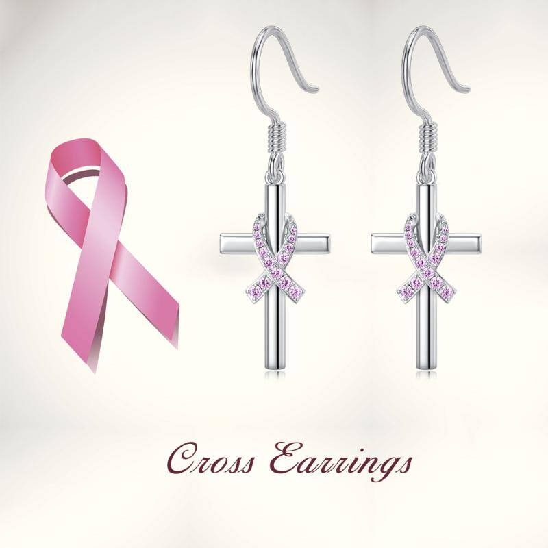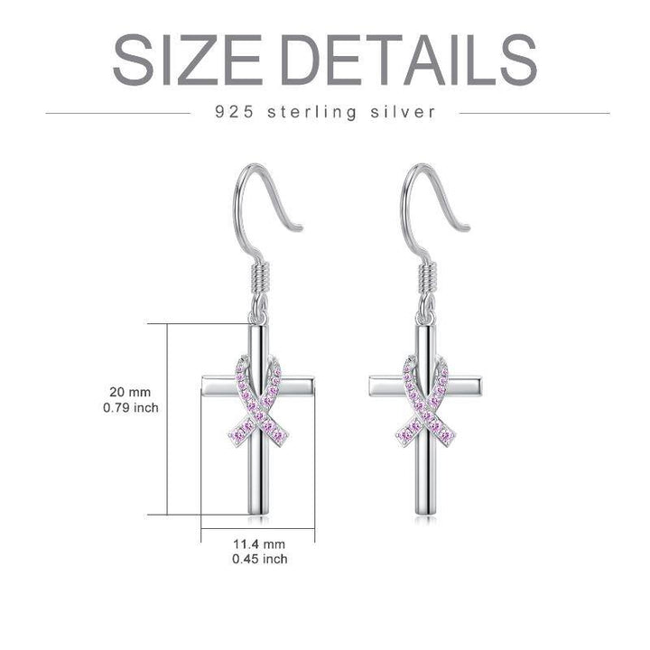 Sterling Silver Cubic Zirconia Breast Cancer & Cross Drop Earrings