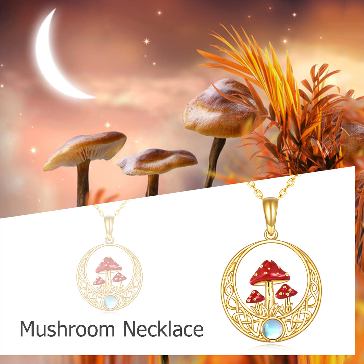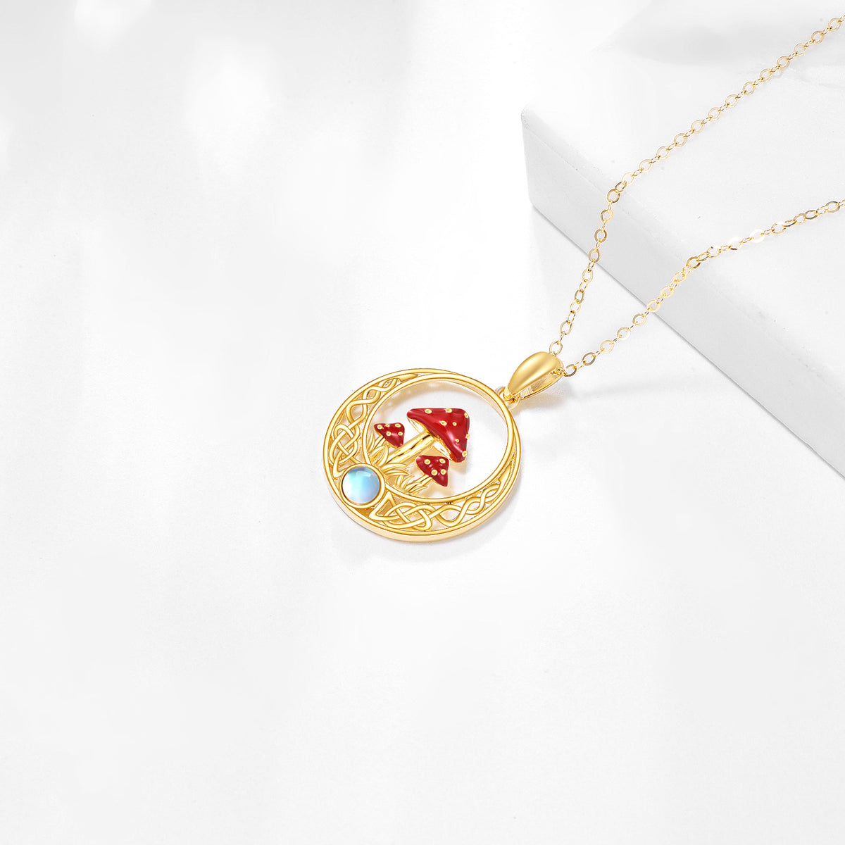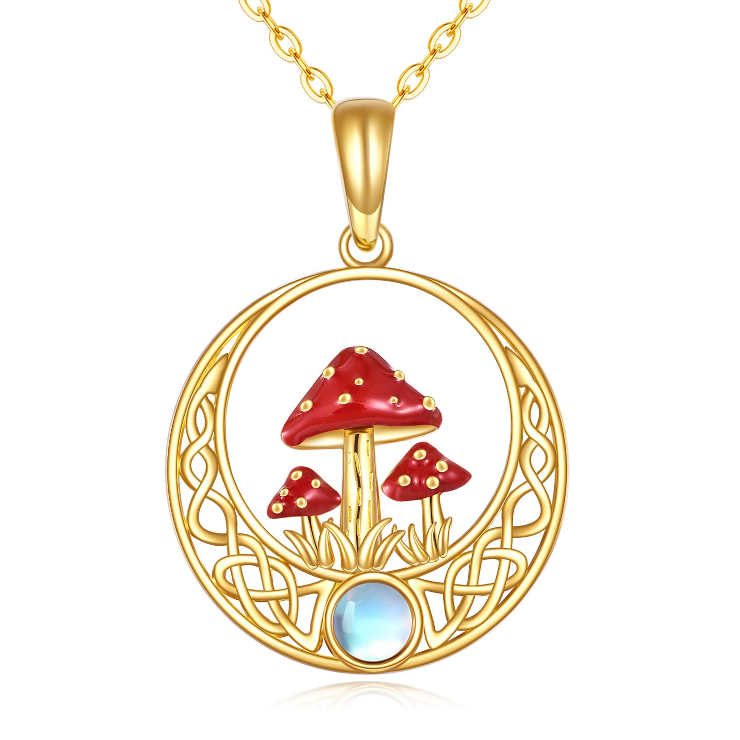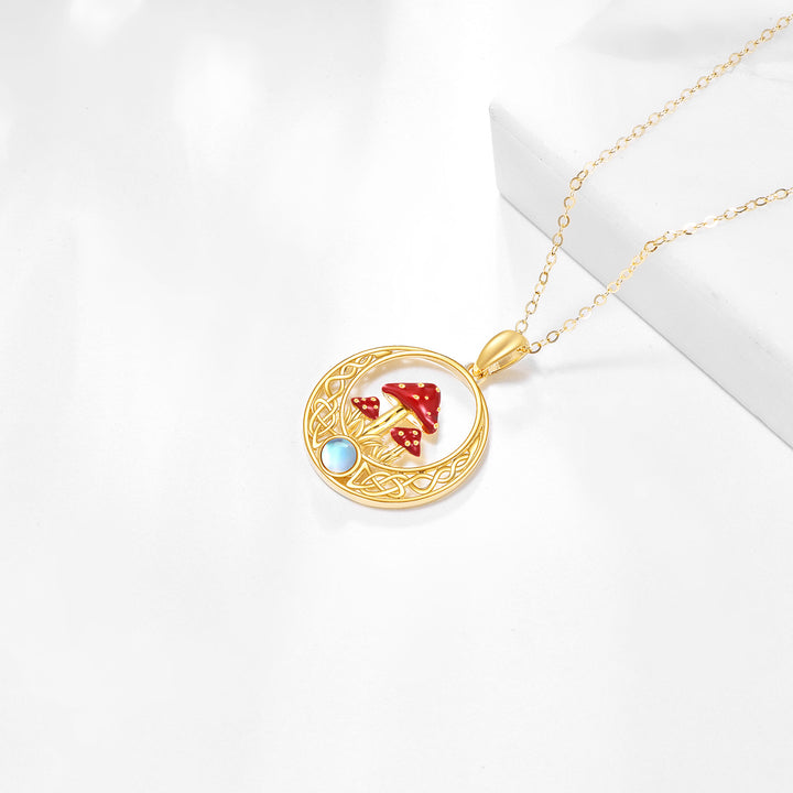 14K Gold Moonstone Mushroom & Celtic Knot Pendant Necklace