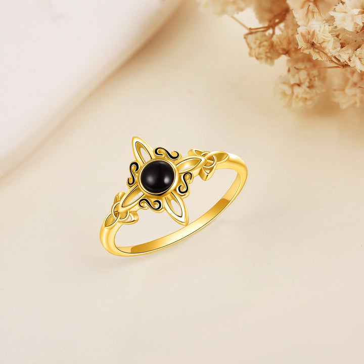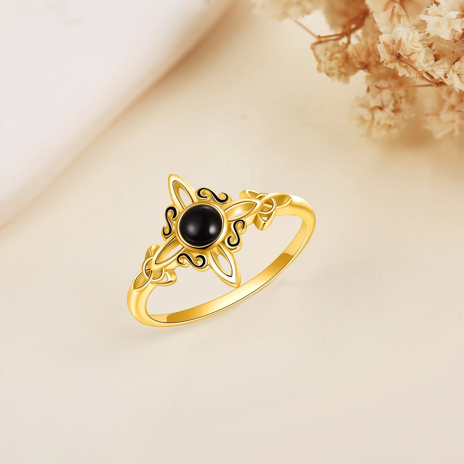 This 14K Gold Agate Celtic Knot Ring by YFN is an epitome of elegance for women. This stunning 14K Gold ring features a mesmerizing black agate stone, intricately set in a band adorned with timeless Celtic knot designs.