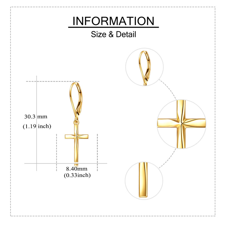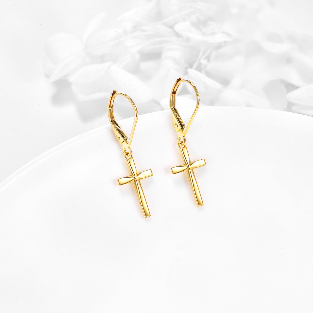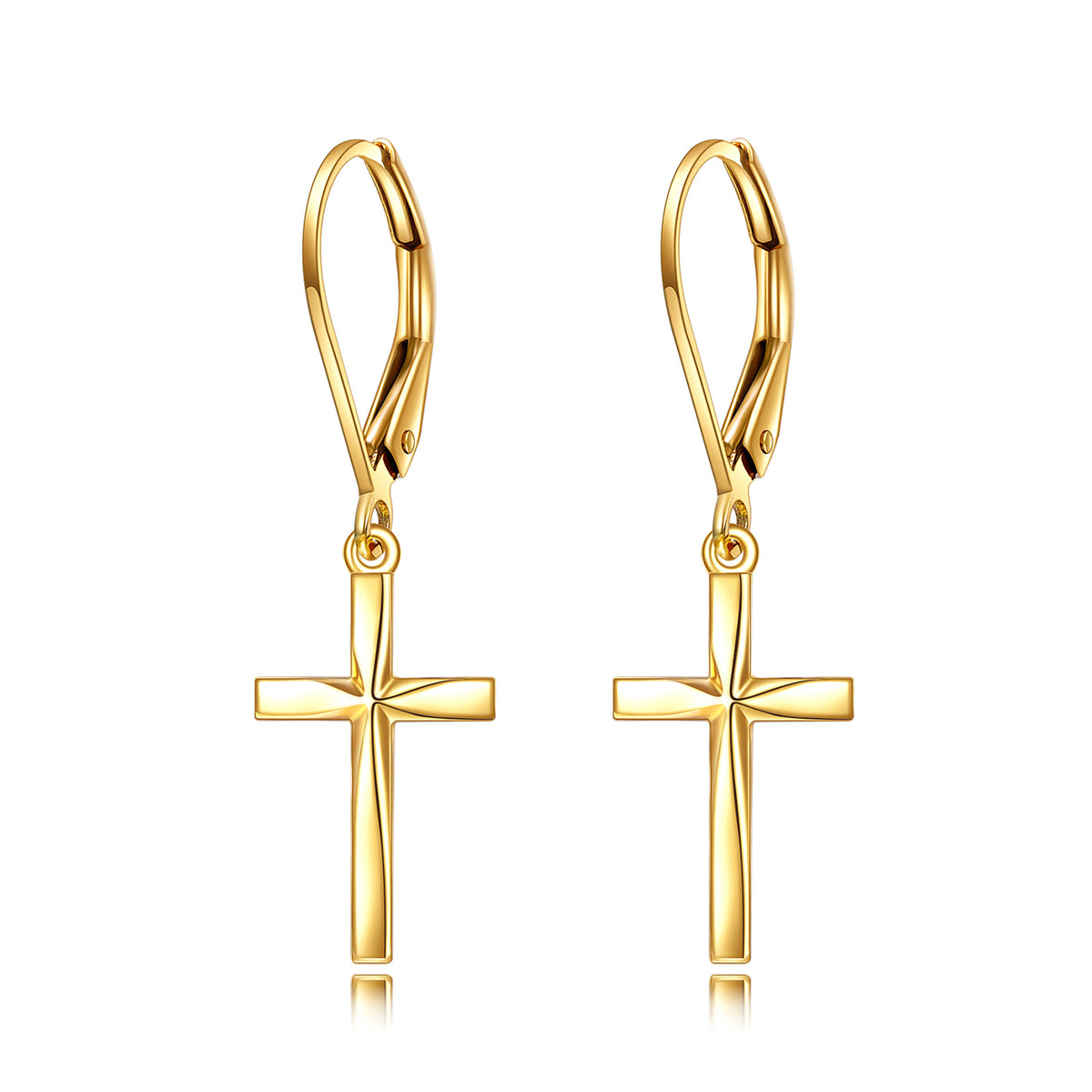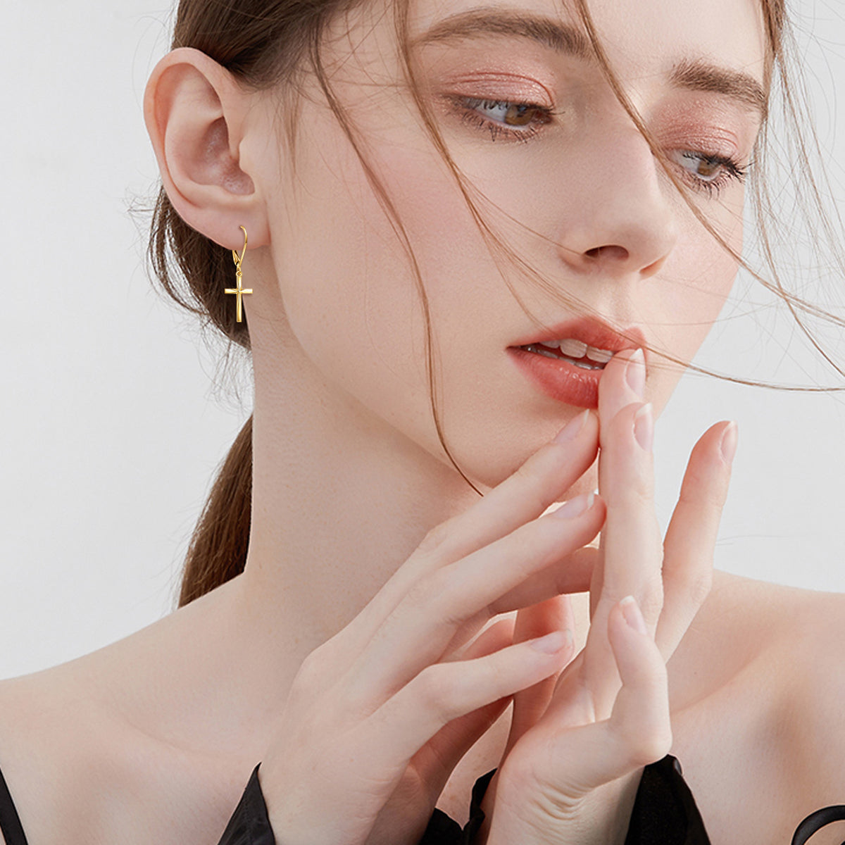 These 14K Gold Cross Lever-back Earrings by YFN are a stone-free accessory for women, highlighting the pure beauty of gold. These exquisite Lever-back Cross Earrings feature a classic cross design in lustrous 14K gold. The lever-back closure ensures comfort and security, making them ideal for everyday wear or special occasions, and the minimalist design complements any wardrobe.
