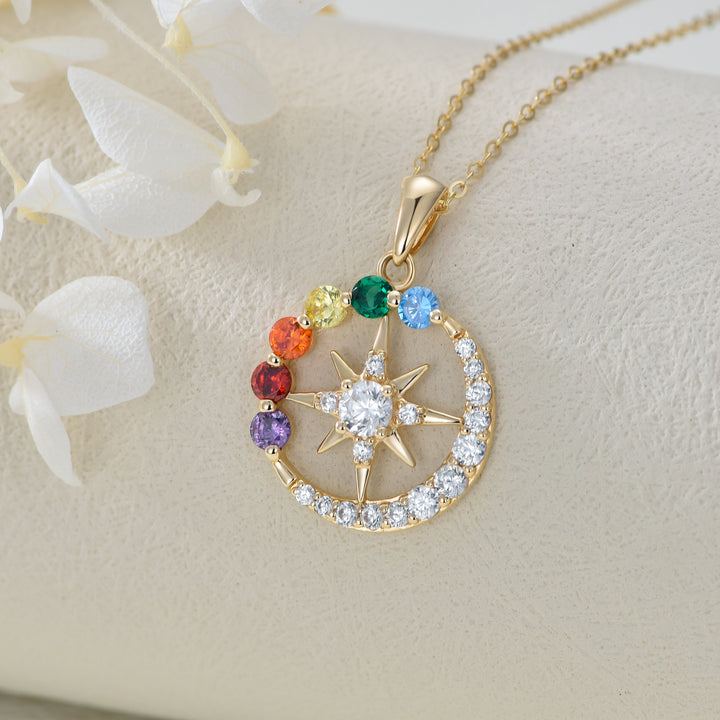 14K Gold Round Zircon Chakras Moon Sun Pendant Necklace For Women