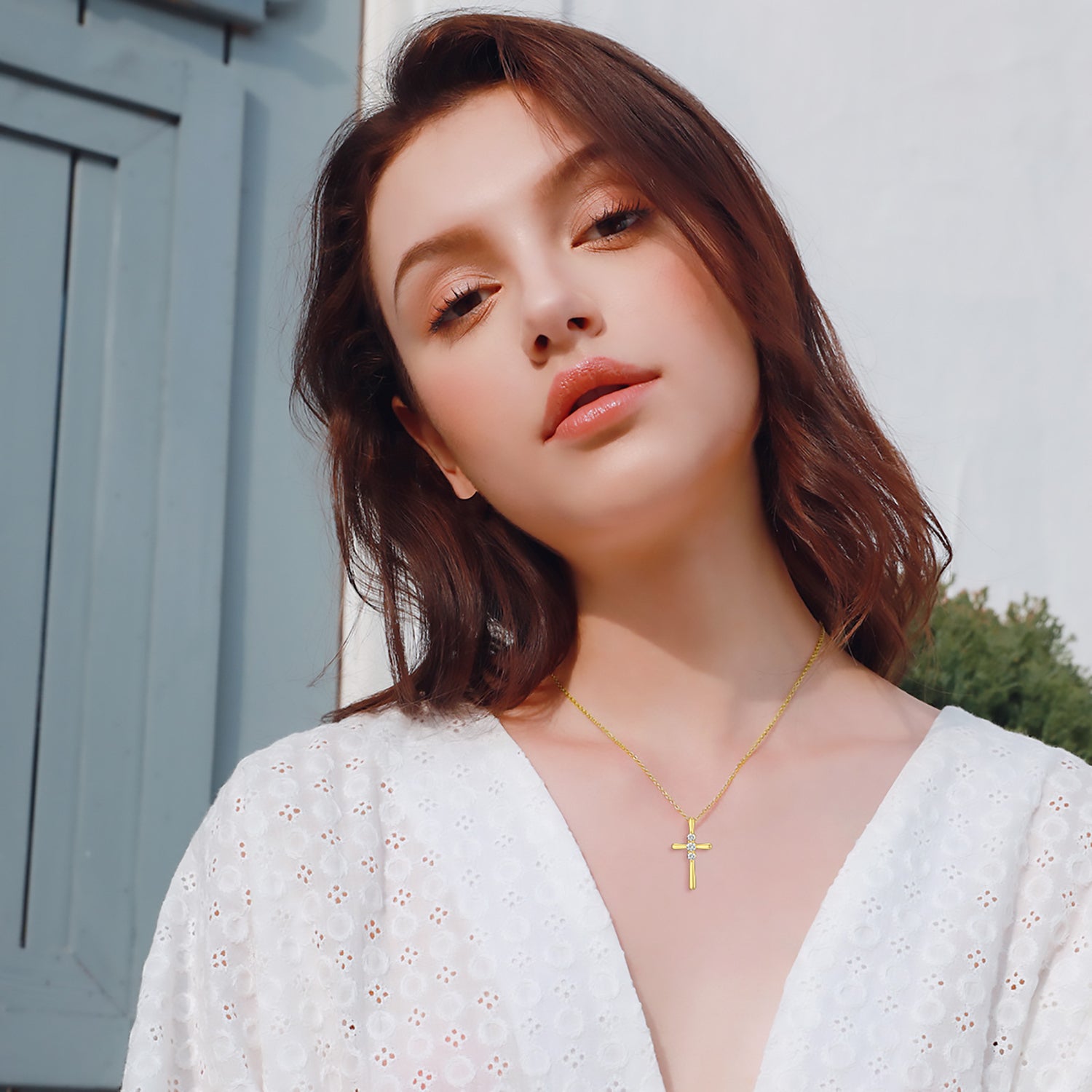 This 14K Gold Circular Shaped Cubic Zirconia Cross Pendant Necklace by YFN features a unique circular shape that holds a beautifully designed Cross encrusted with sparkling white Cubic Zirconia gems. Crafted from high-quality 14K Gold, the combination of the classic cross symbol with luxurious gold and dazzling stones makes this piece versatile and timeless, embodying grace and elegance.