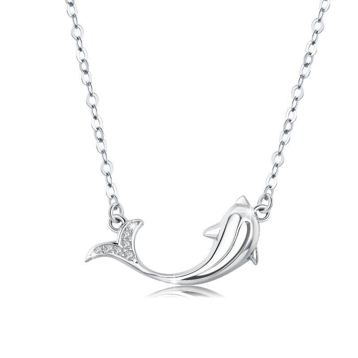 Crafted from Sterling Silver with White Gold Plating, this Circular Shaped Pendant Necklace features clear Cubic Zirconia and an enchanting Dolphin Design.