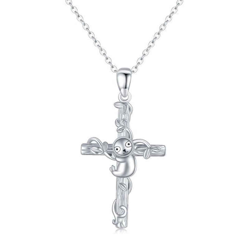 Sterling silver; white gold plating; sloth and cross pendant; chain necklace.
