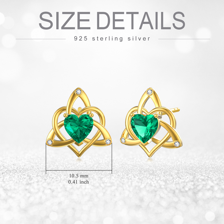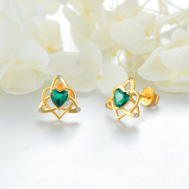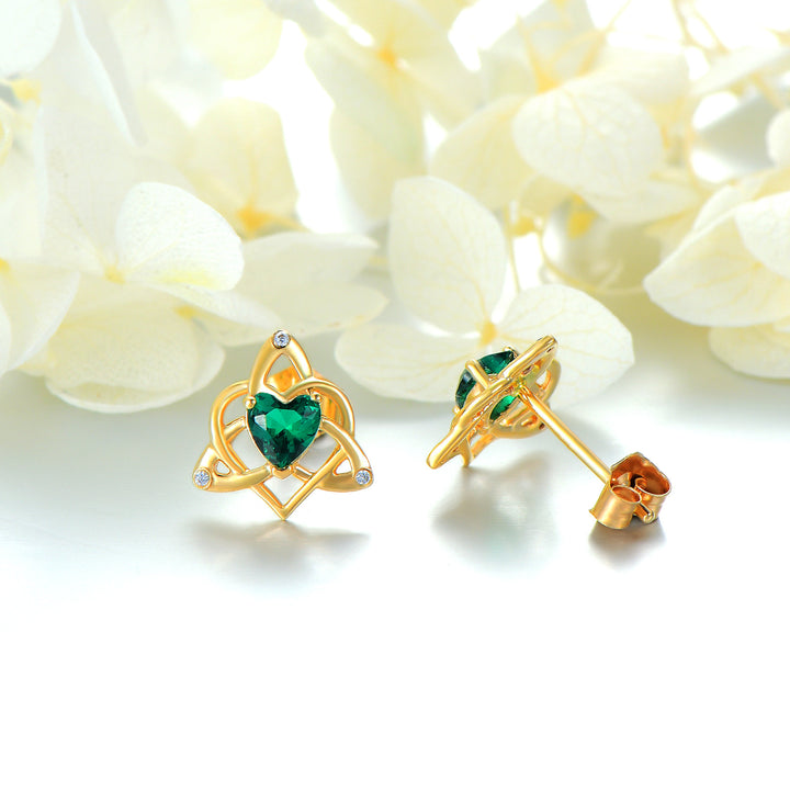 Crafted from solid 14K Gold. These are stud earrings featuring a Celtic Knot design and set with a Heart Cut Green Cubic Zirconia.