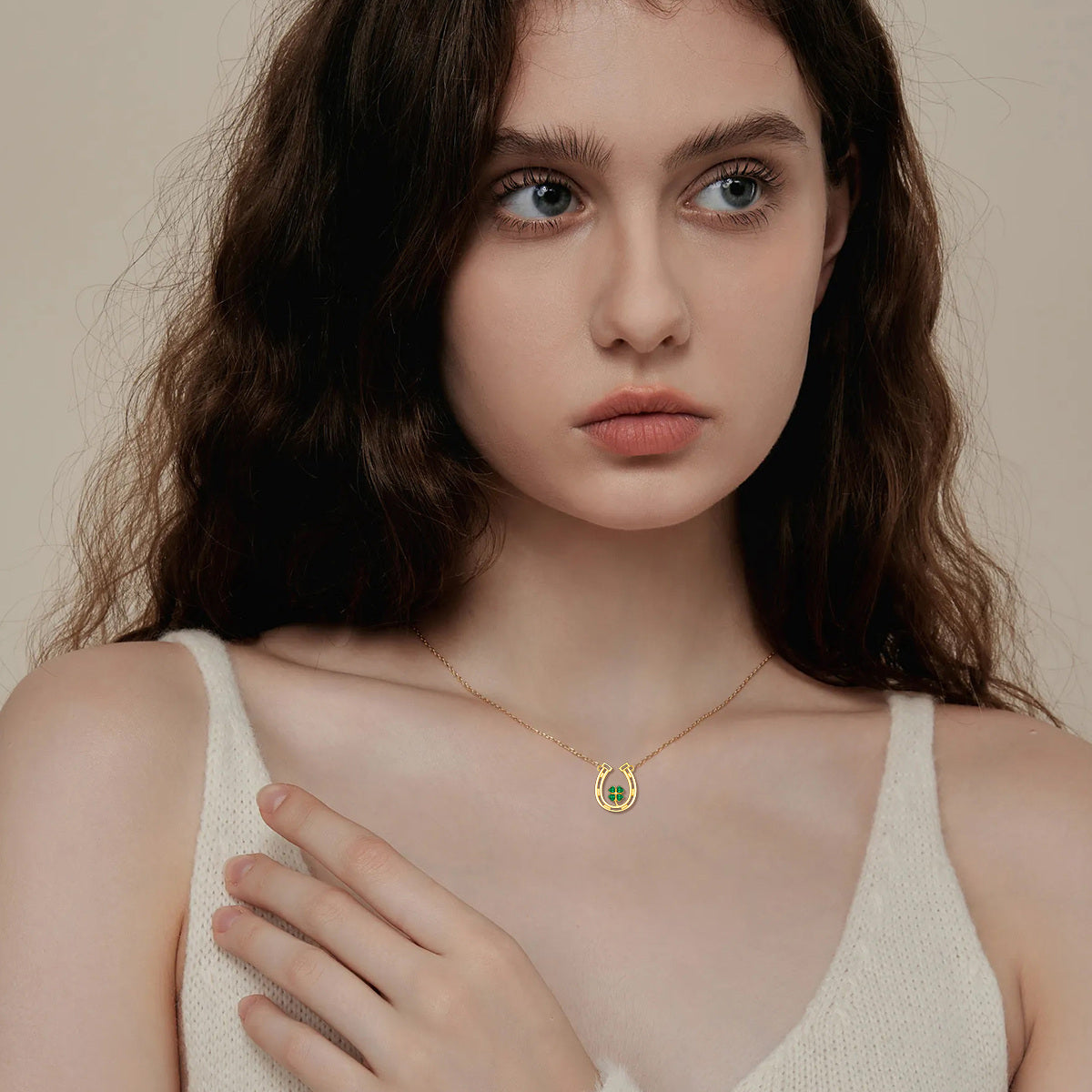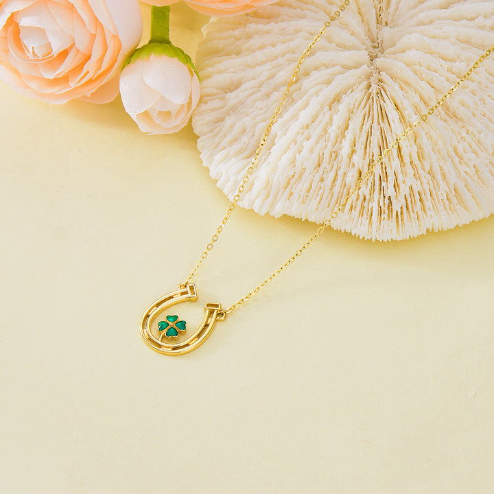 This Heart-Shaped Pendant Necklace is Crafted from 14K Gold, adorned with Sparkling Green Cubic Zirconia and a Four Leaf Clover Horseshoe Motif.