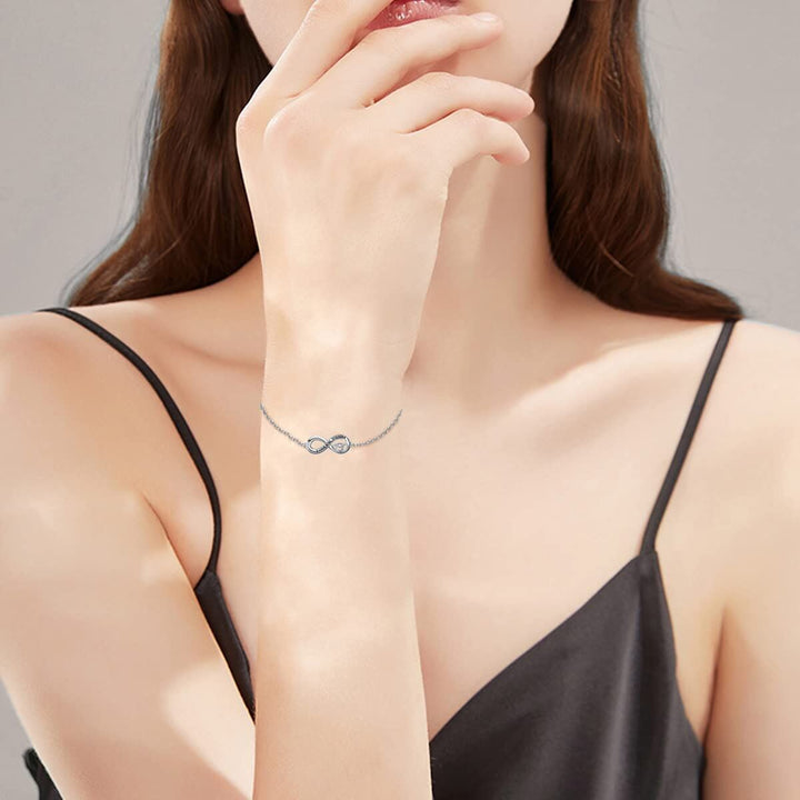 Sterling silver with white gold plating. Infinity charm with engraved wording. No-stone design. Adjustable bracelet chain.