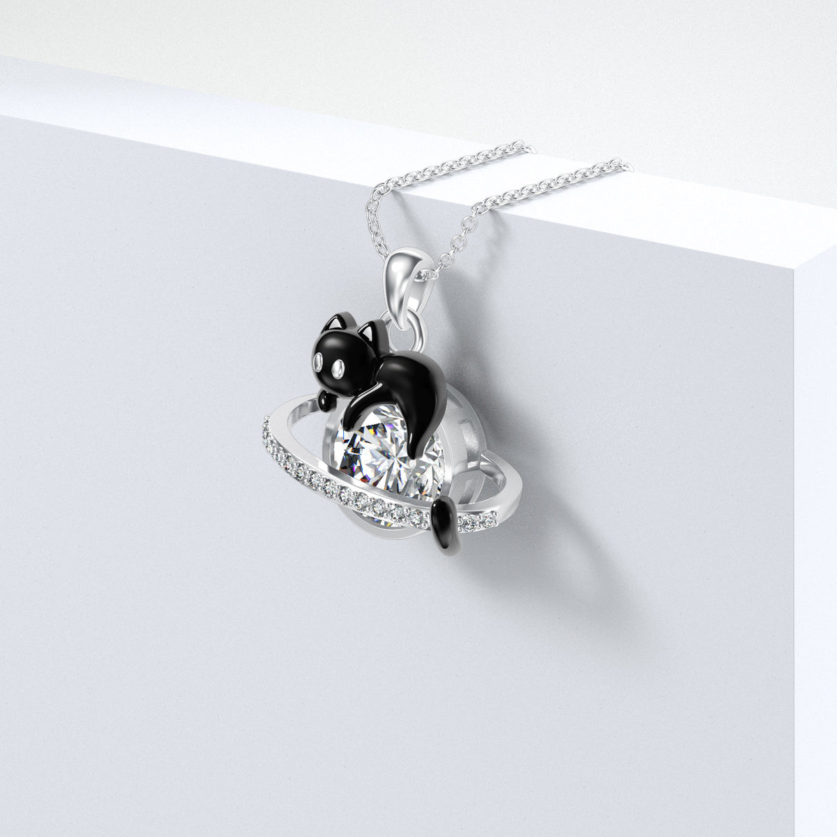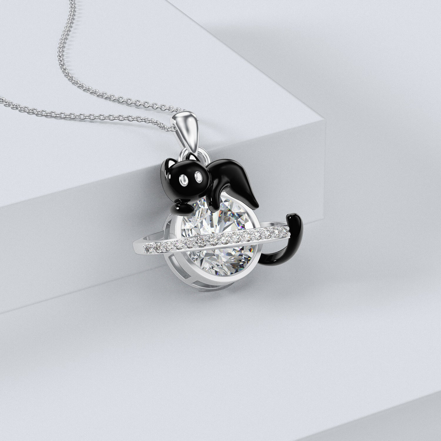 This pendant necklace is made of luxurious 14K white gold and features a delightful cat and planet design embellished with brilliant round moissanite gemstones.