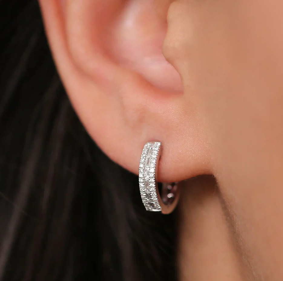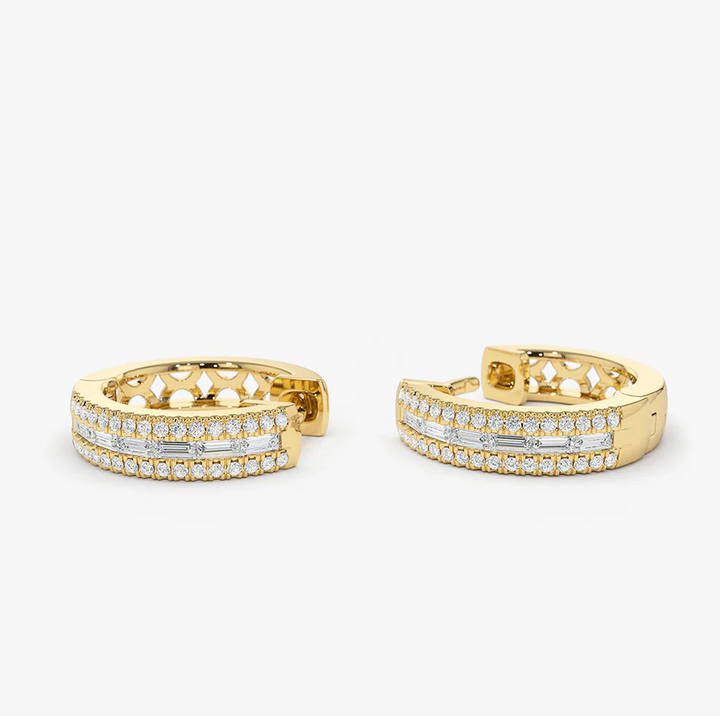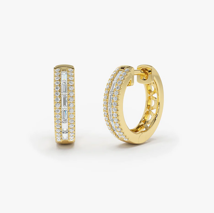 14K Solid Gold 0.5 CT.T.W. Pave Natural Diamonds and Baguette Hoop Earrings