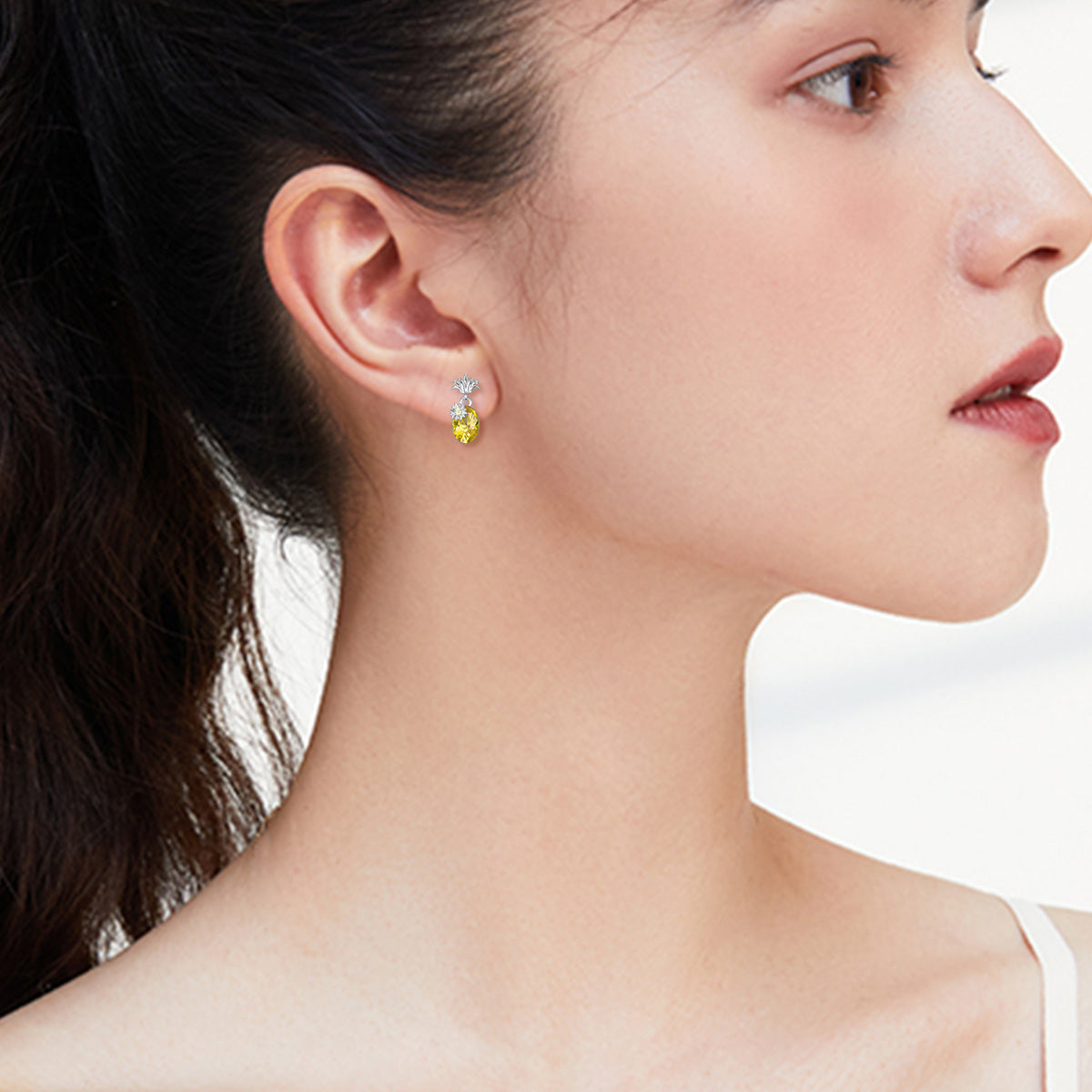 Crafted from 14K Solid White Gold, these stud earrings feature a Pineapple motif and are set with lab-created Citrine stones.