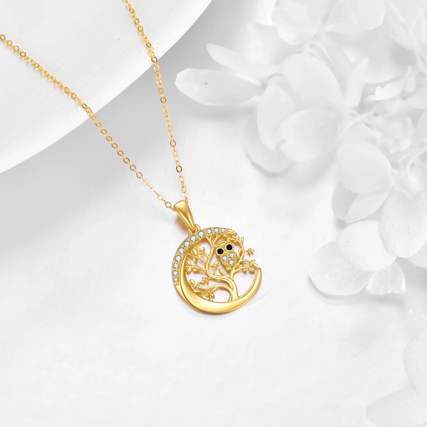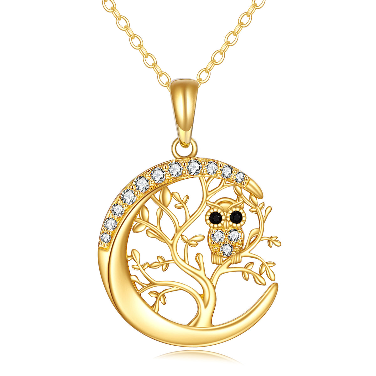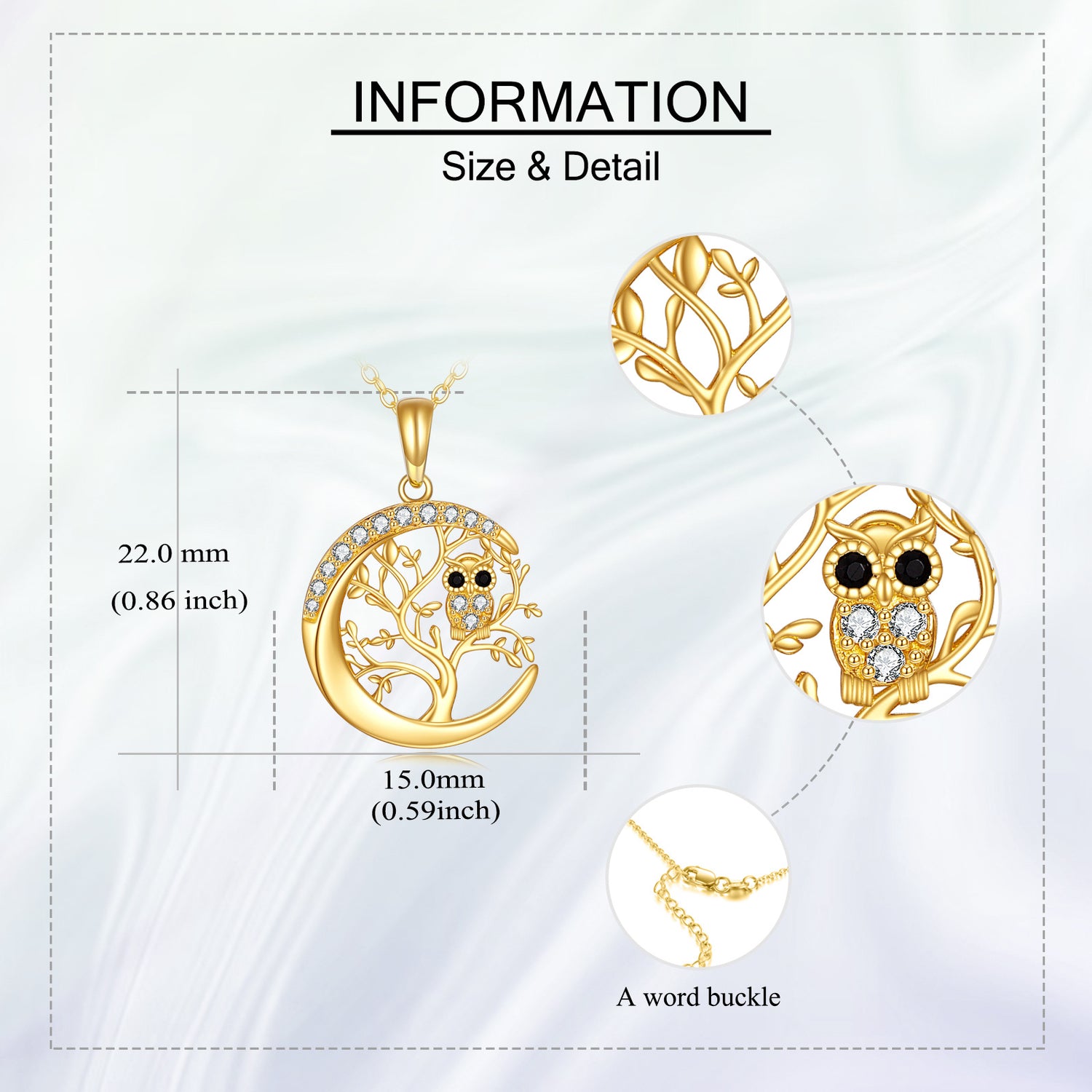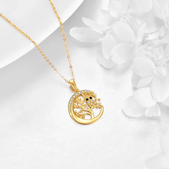 14K Gold Cubic Zirconia Owl & Tree Of Life With Moon Pendant Necklace For Women