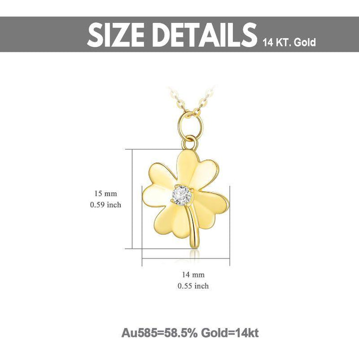 14K gold; Moissanite gemstone; four-leaf clover pendant; rolo chain.