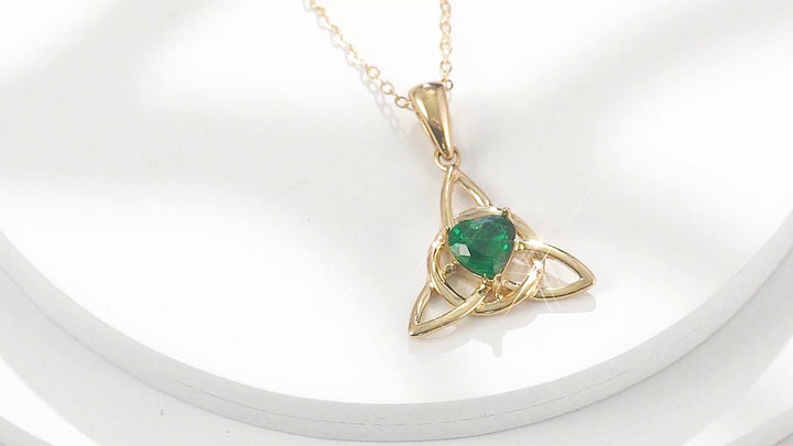 Crafted from 14K Gold, featuring a Pendant Necklace with a Heart-Shaped Green Crystal and a Celtic Knot Pattern.