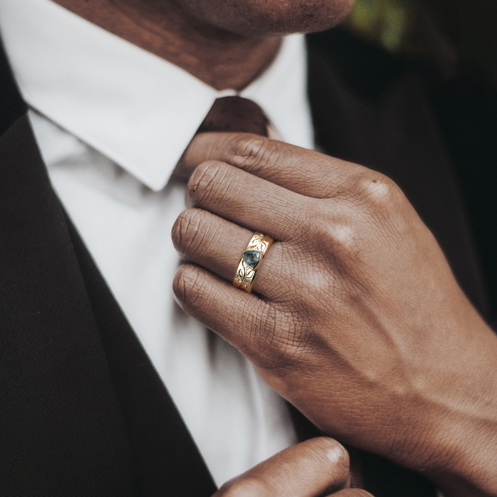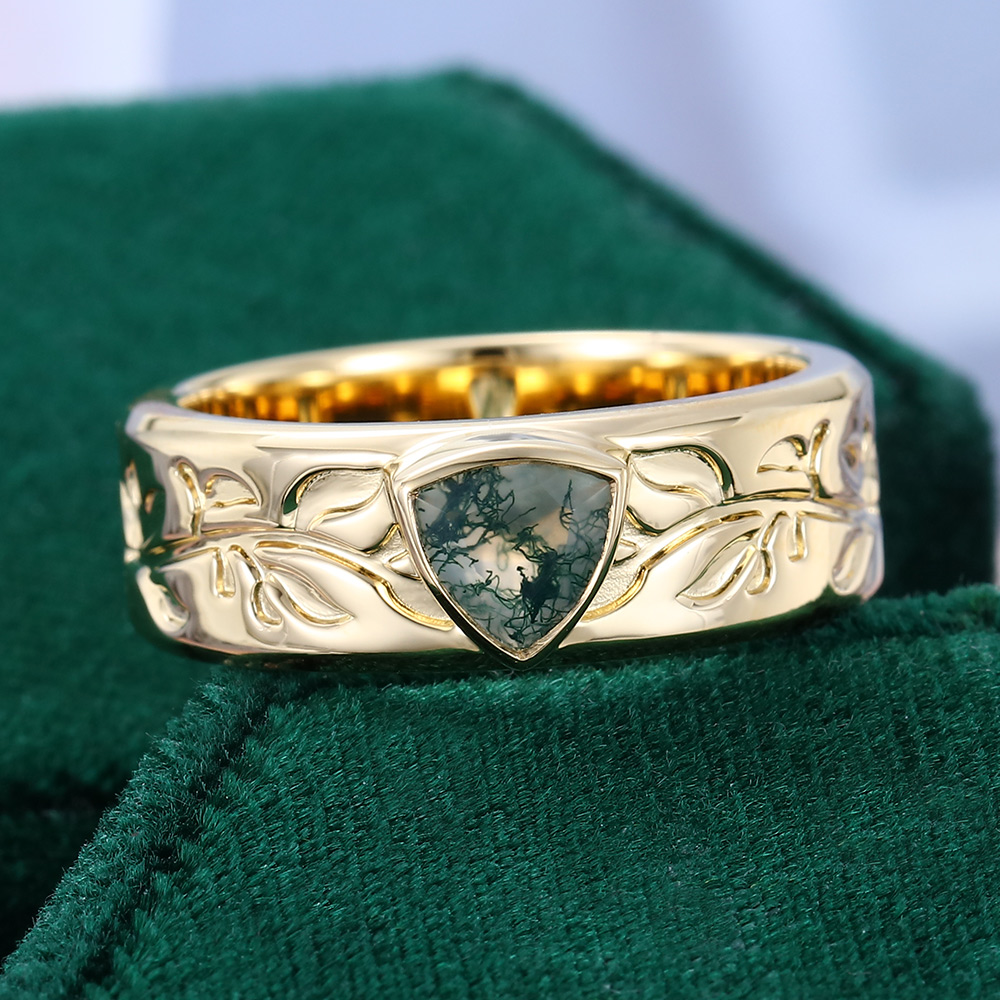 Crafted in sterling silver with yellow gold plating. Features a 0.55 CT trillion-cut moss agate center stone. Vintage-style unisex wedding band design.